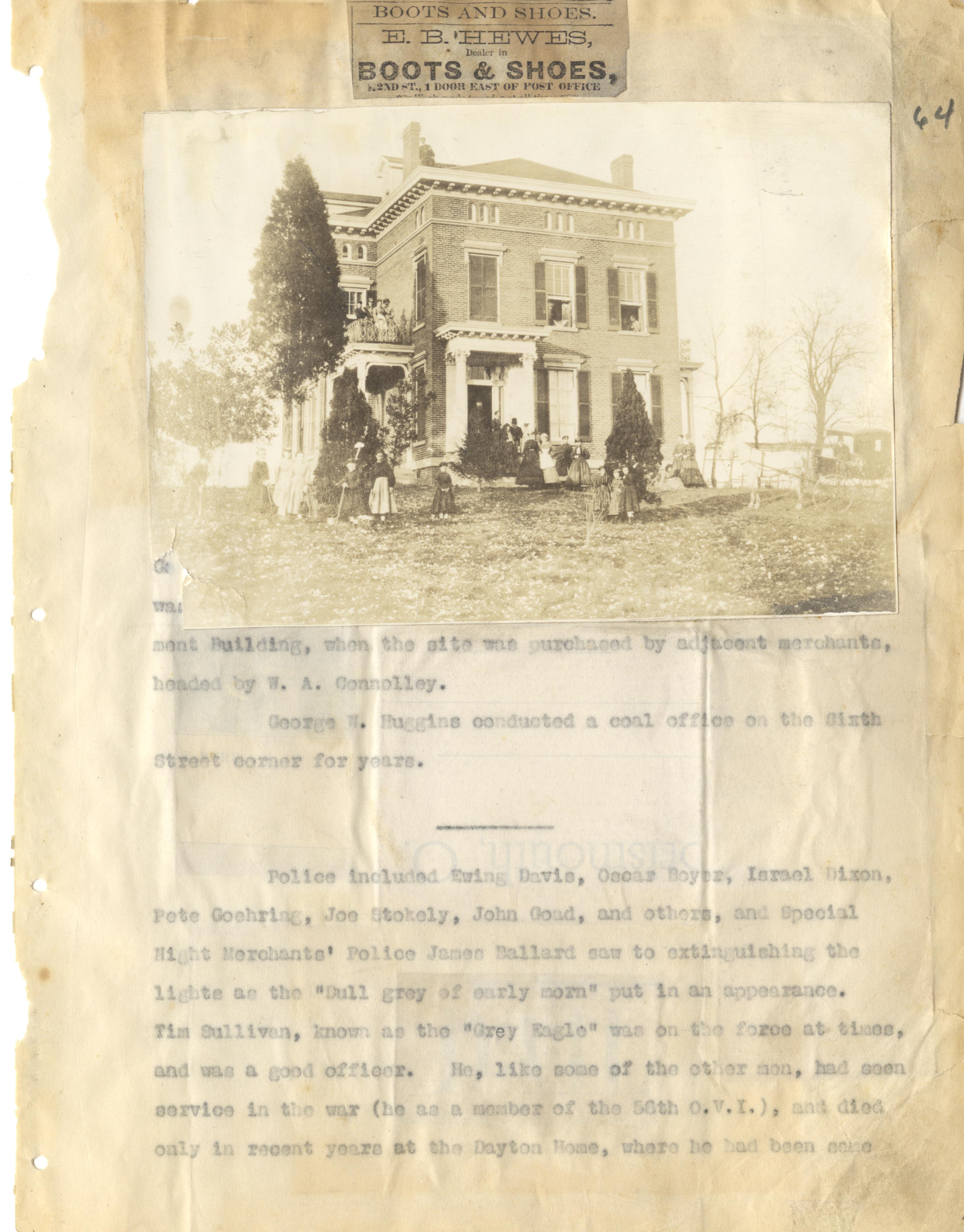- Photo image of scanned scrapbook page: Pictured is a prominent house in Portsmouth. Typed page detailing events involved with the Portsmouth Police