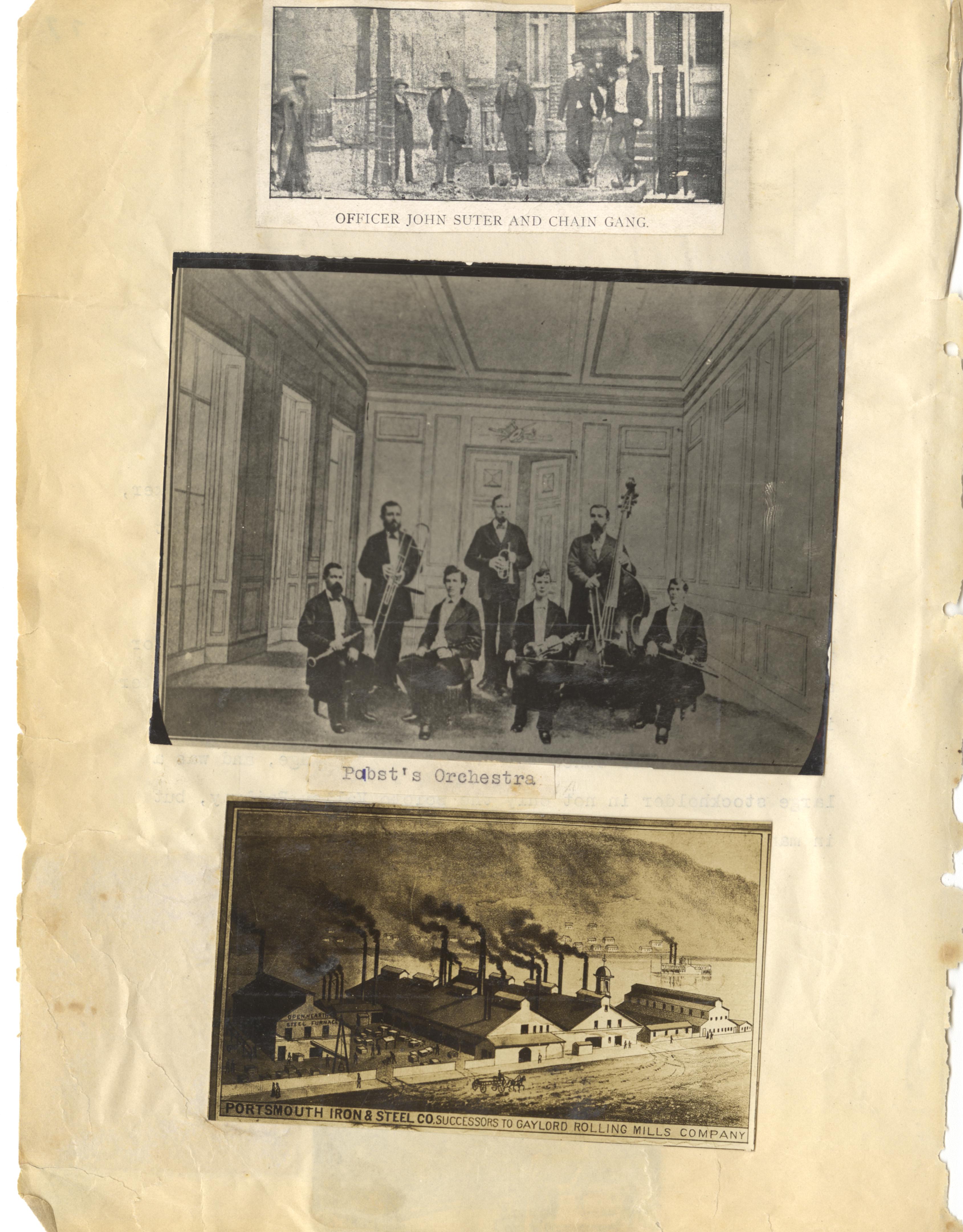 - Photo image of scanned scrapbook page: Officer John Suter and Chain Gang. The Chain Gang was a group of prisoners chained together and forced to do physically challenging work as punishment. Pabst's Orchestra (middle) performed in the Wilhelm Opera House at the corner of Fourth (4th) and Court Streets and also played music at many social events in Portsmouth. It was led and conducted by Anton Pabst and began in 1875. Portsmouth Steel Company (bottom) was the Steel Mill in New Boston. It was called the Portsmouth Steel company from 1902 to 1909.