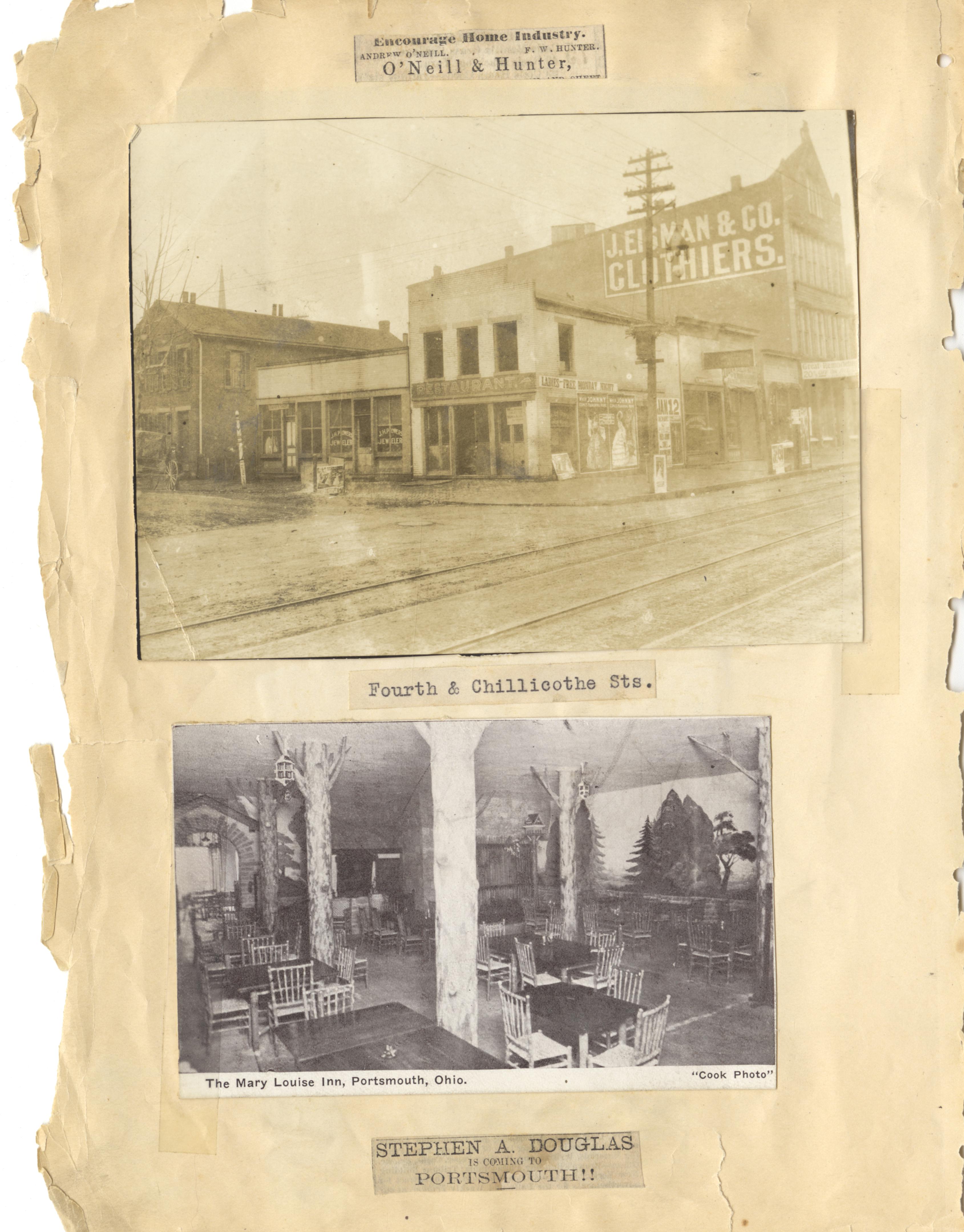 - Photo image of scanned scrapbook page: Fourth (4th) and Chillicothe Street showing J. Elsman & Co. Clothiers, a restaurant on the corner, and J. H. Powers, Jeweler