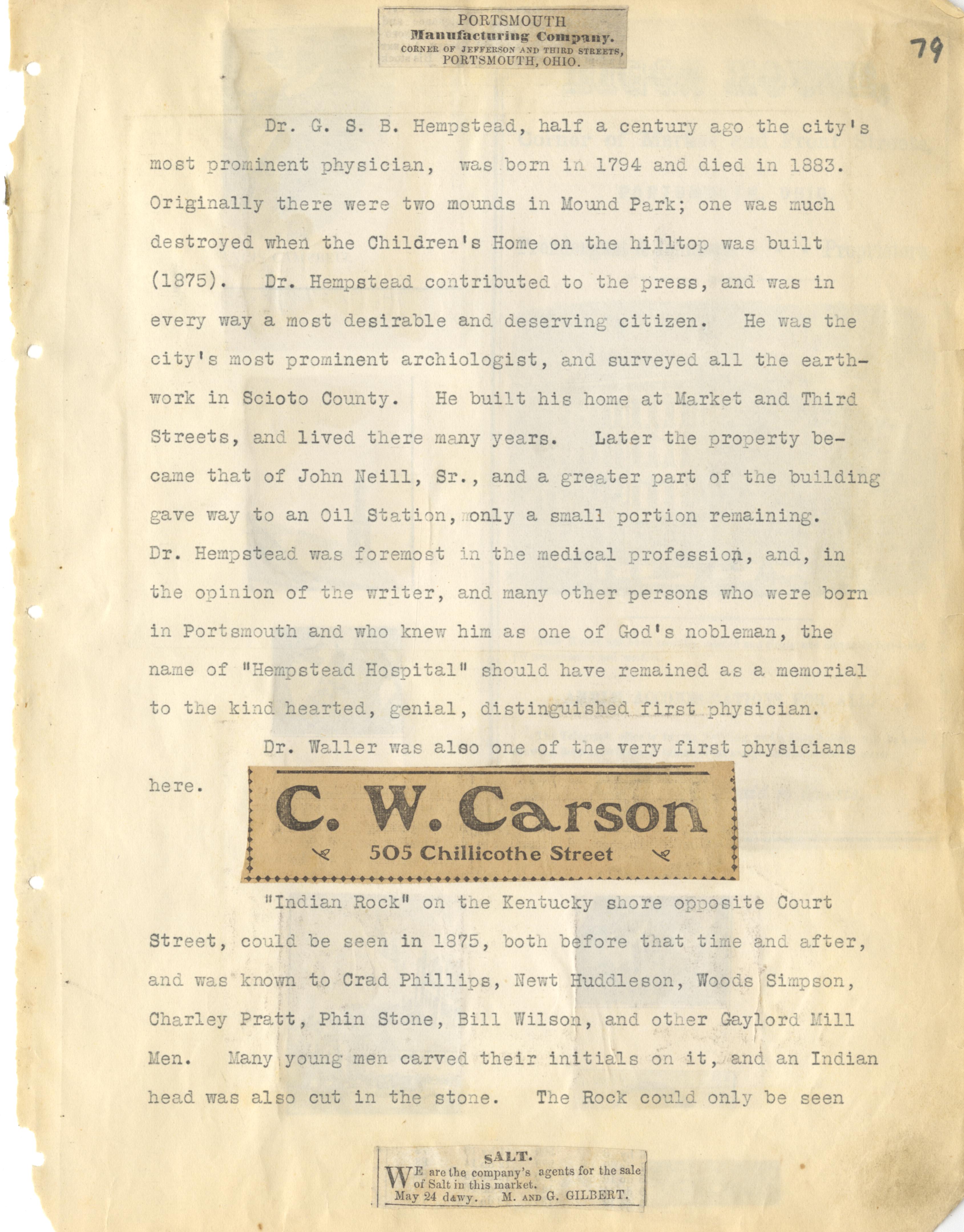 - Photo image of scanned scrapbook page: typed page about Dr. G. S. B. Hempstead, Portsmouth' most prominent physician. Bottom of typed page is the beginning of a story about the Indian Head Rock found in the Ohio River, another page continues the story.