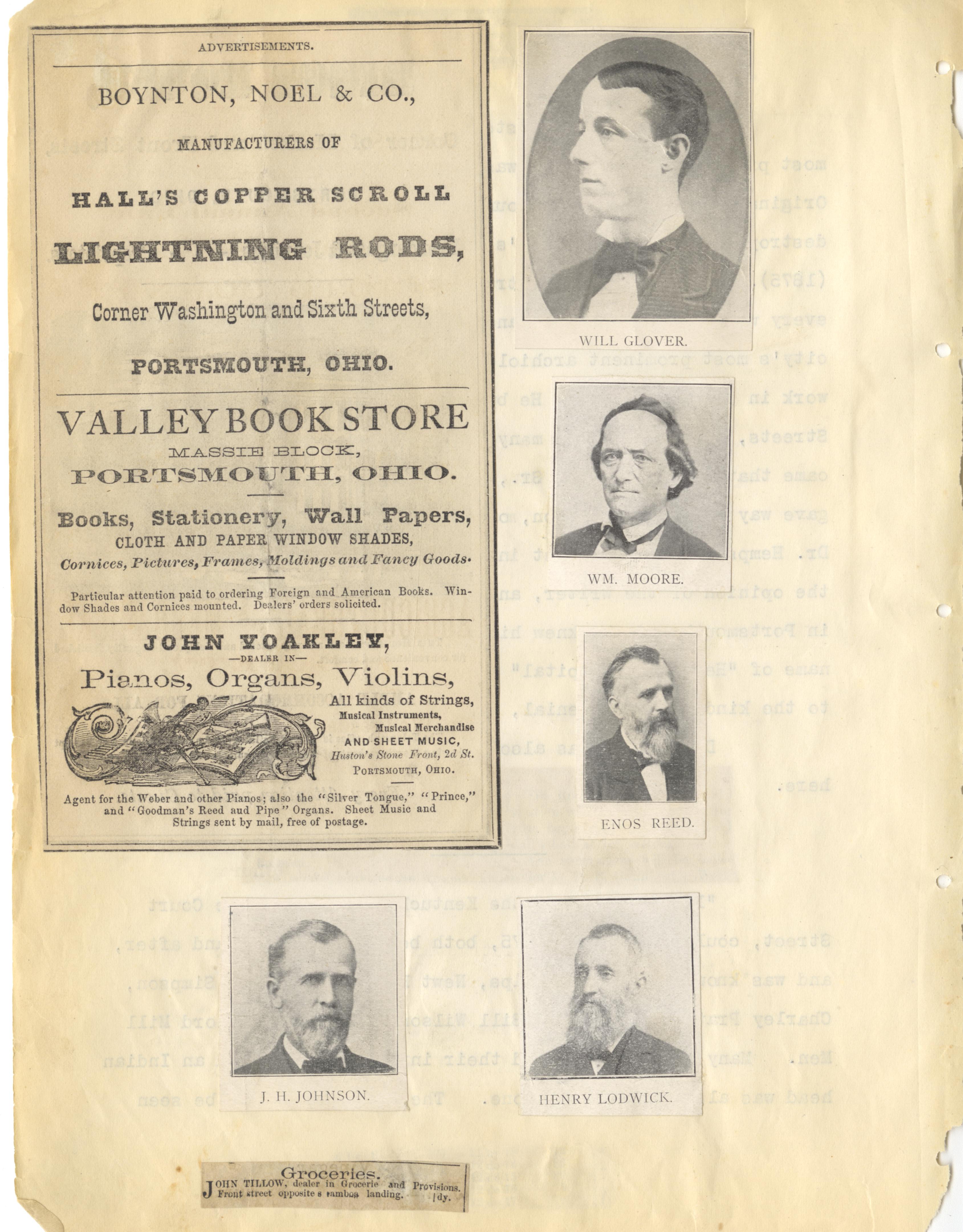 - Scanned scrapbook page: Newspaper Advertisements for Portsmouth, pictured: Will Glover, Wm Moore- riverboat captain, Enos Reed, J. H. Johnson, and Henry Lodwick