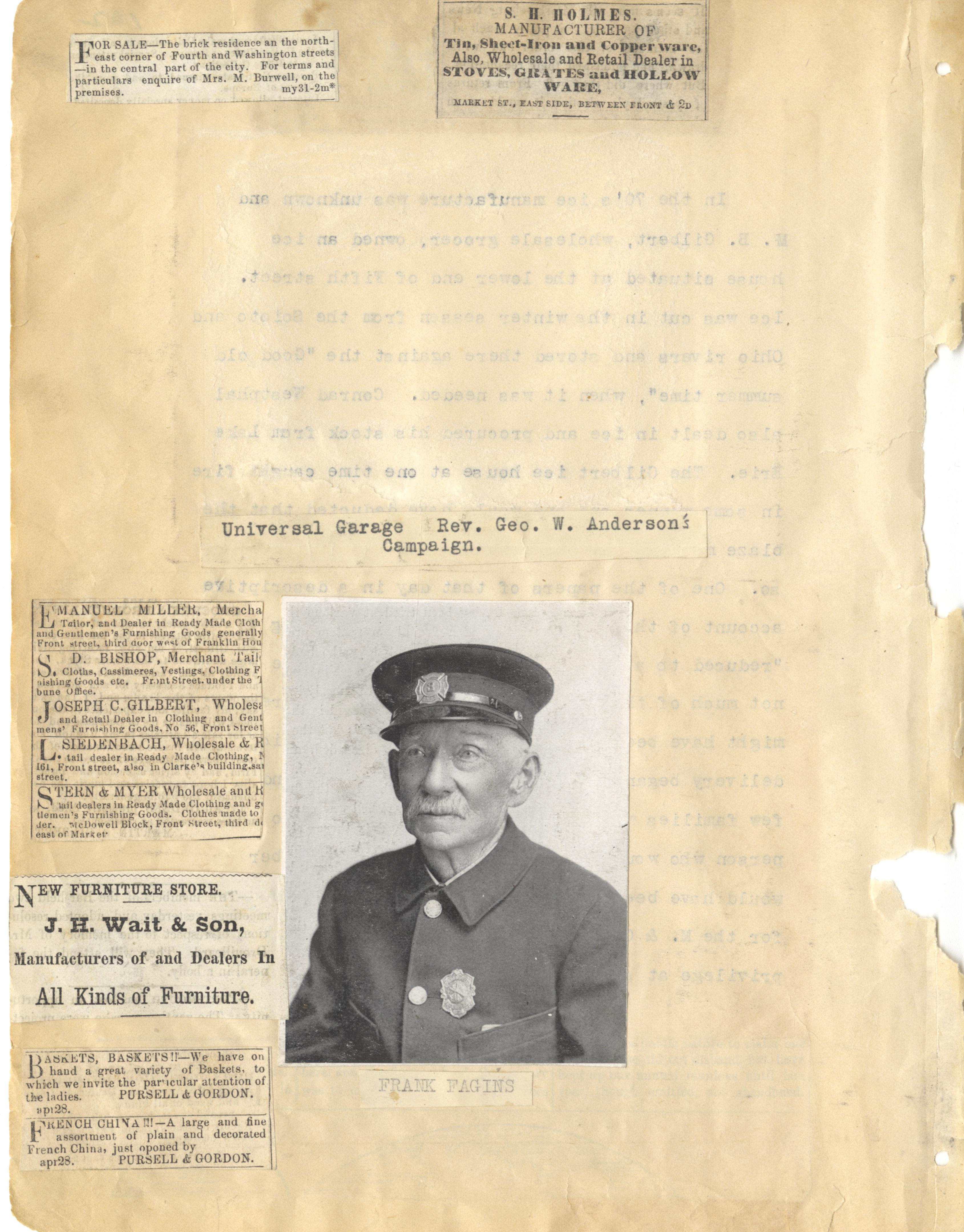 - Photo image of scanned scrapbook page: Frank Fagins and Portsmouth business ads from the newspaper