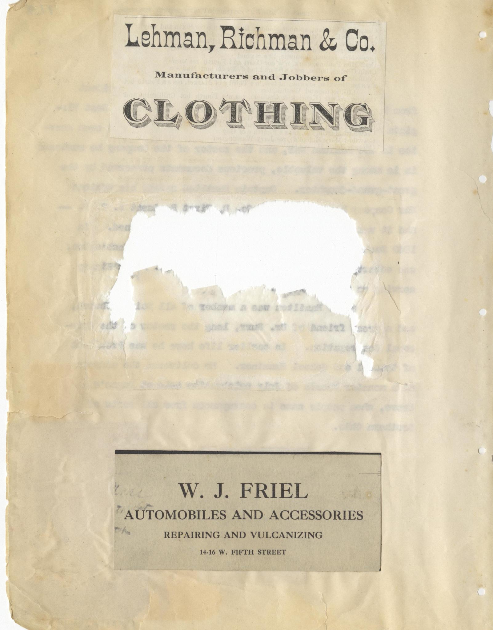 - Photo image of scrapbook page: newspaper ads: Lehman, Richman & Co. on Chillicothe Street and W. J. Friel Automobiles and Accessories located at 14-16 W Fifth (5th) Street