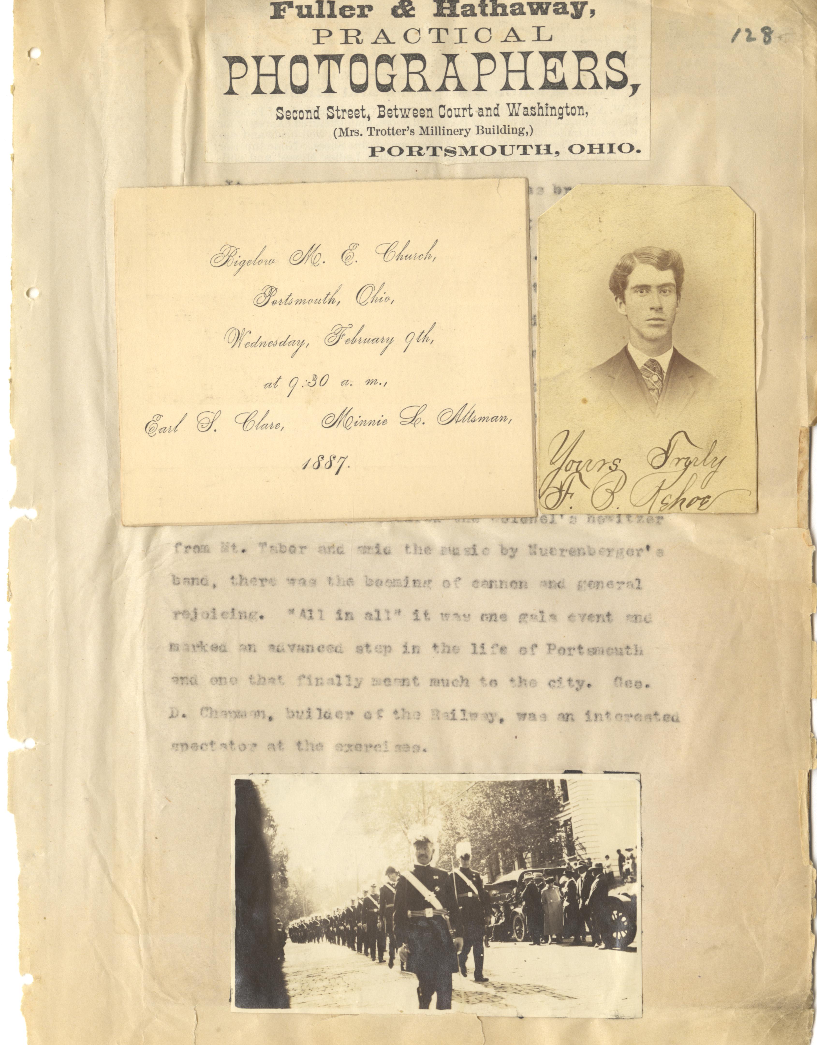 - Photo image of scanned scrapbook page: Wedding invitation for Earl S. Clare and Minnie L.. Altsman, F. B. Kehoe, Parade, Fuller & Hathaway Practical Photographers located on Second (2nd) Street