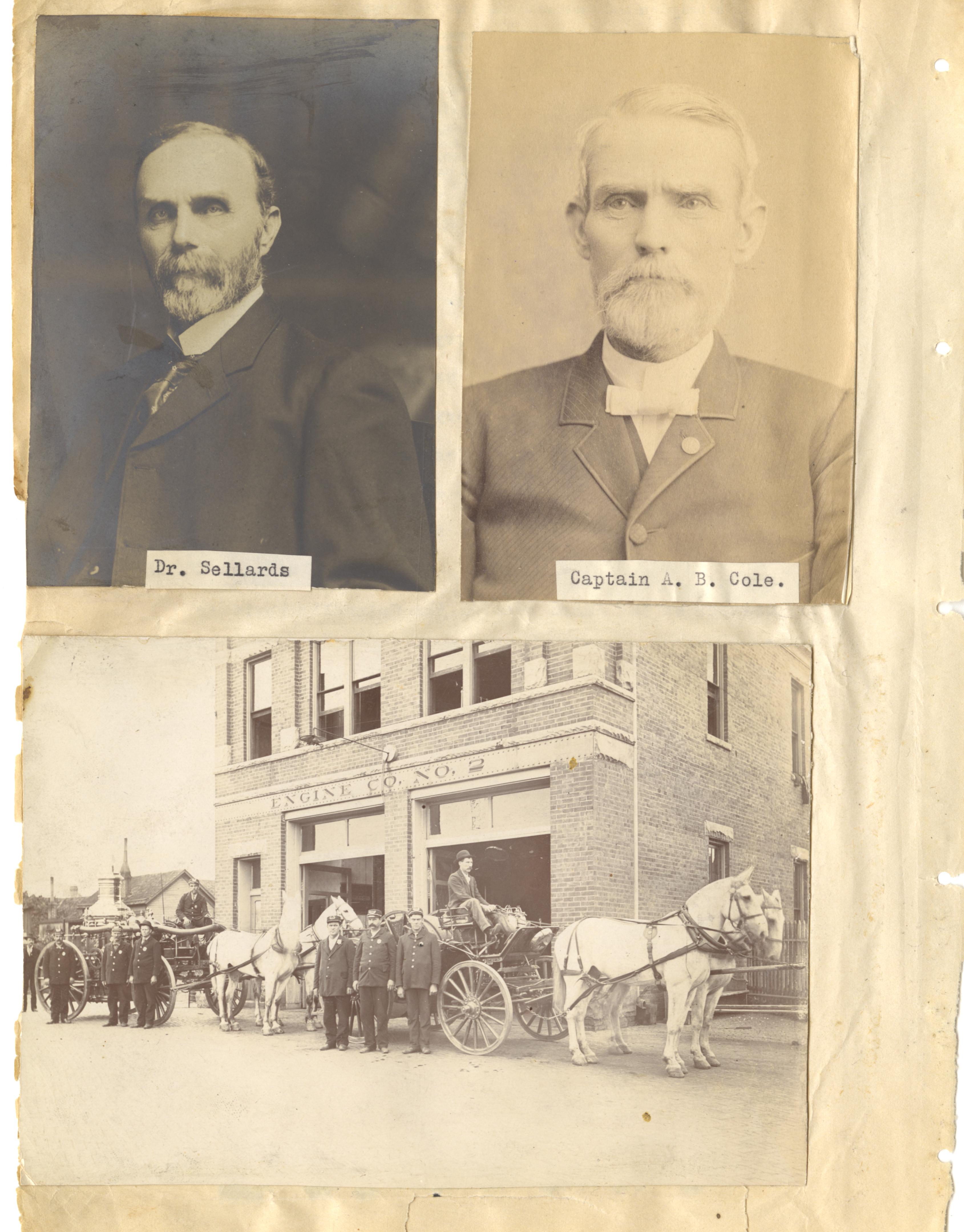 - Black and white photo image of scanned page from scrapbook: Dr. Sellards, Captain A. B. Cole, and Engine No. 2