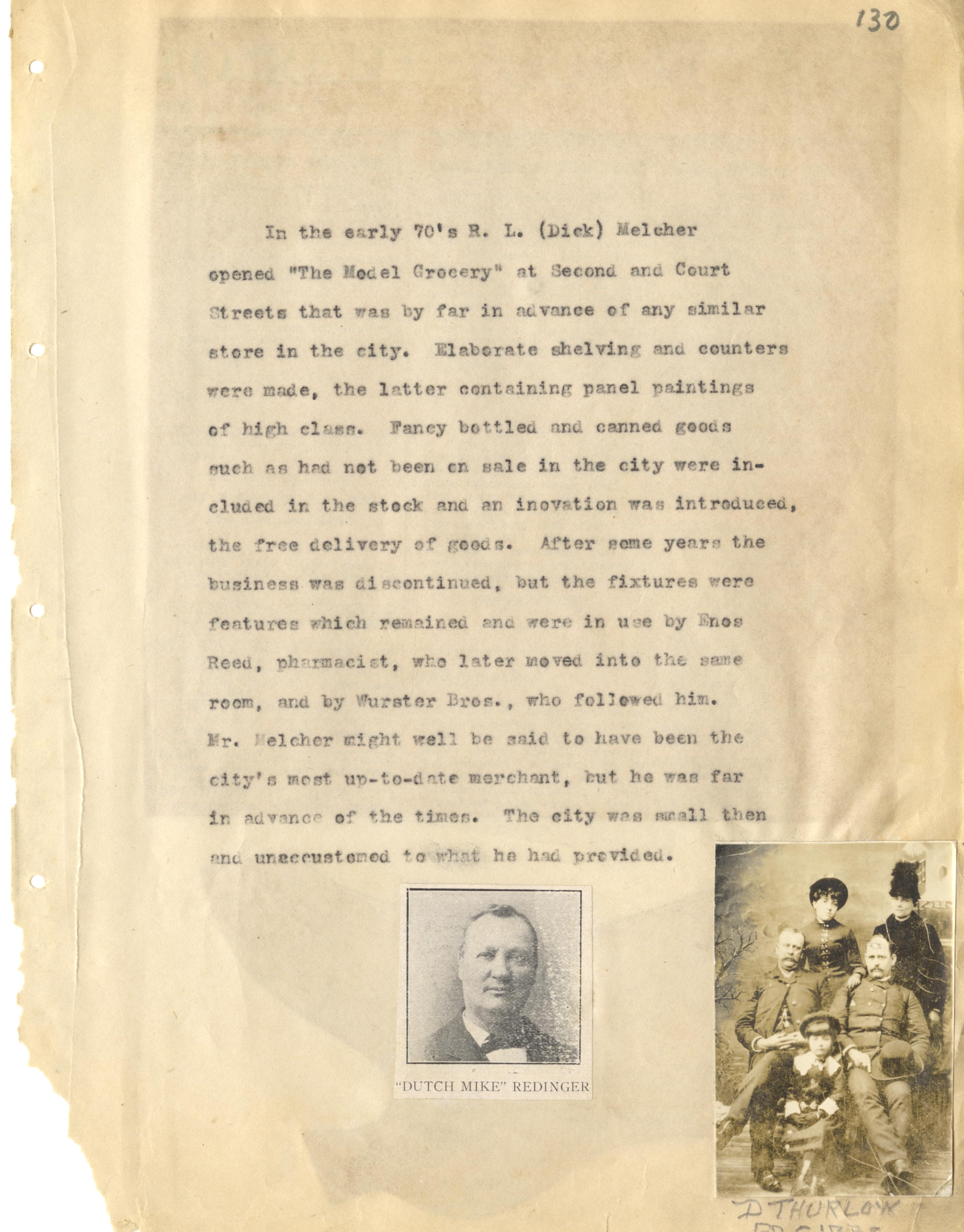 - Photo image of scanned scrapbook page: typed page detailing the beginnings of the Model Grocery Store, started by R. L. Melcher at Second (2nd) and Court Streets (early 1870's)