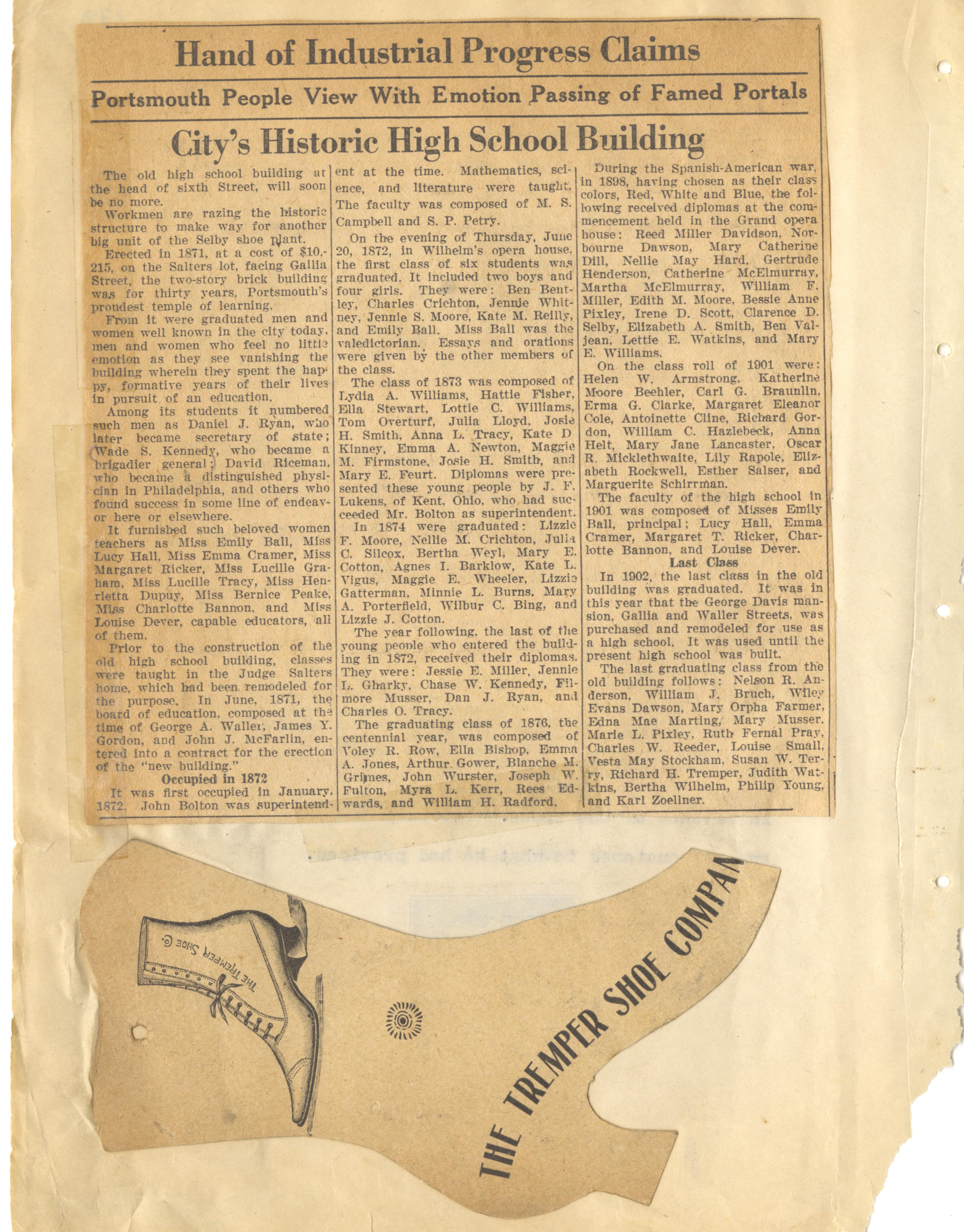 - Photo image of scanned scrapbook page: newspaper article about the demolition of the High School on Sixth (6th) Street and a shoe-shaped ad for the Tremper Shoe Company, incorporate in 1895 and located at the corner of Second (2nd) and Jefferson Streets.