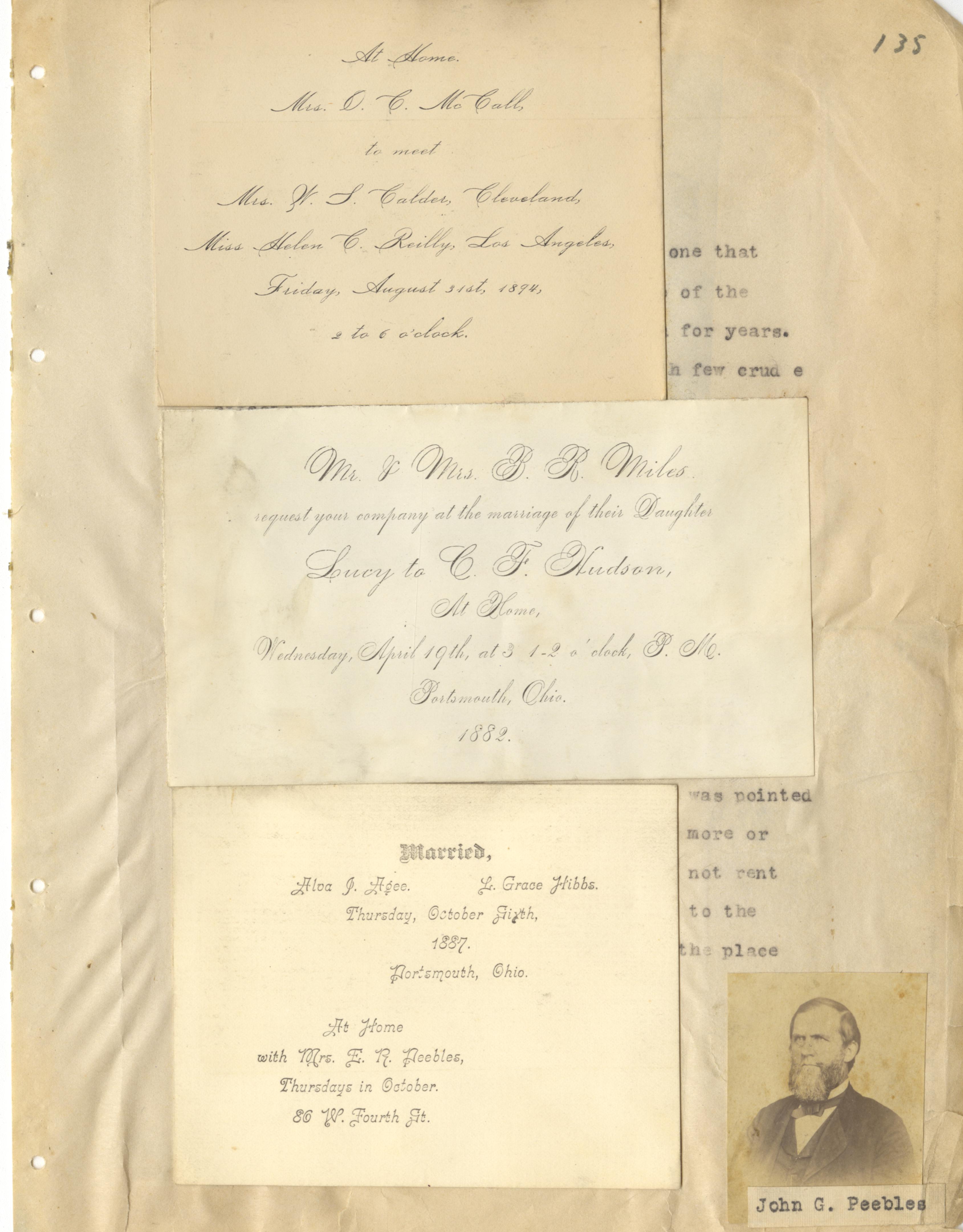 - Photo image of scanned scrapbook page: various invitations and John Peebles