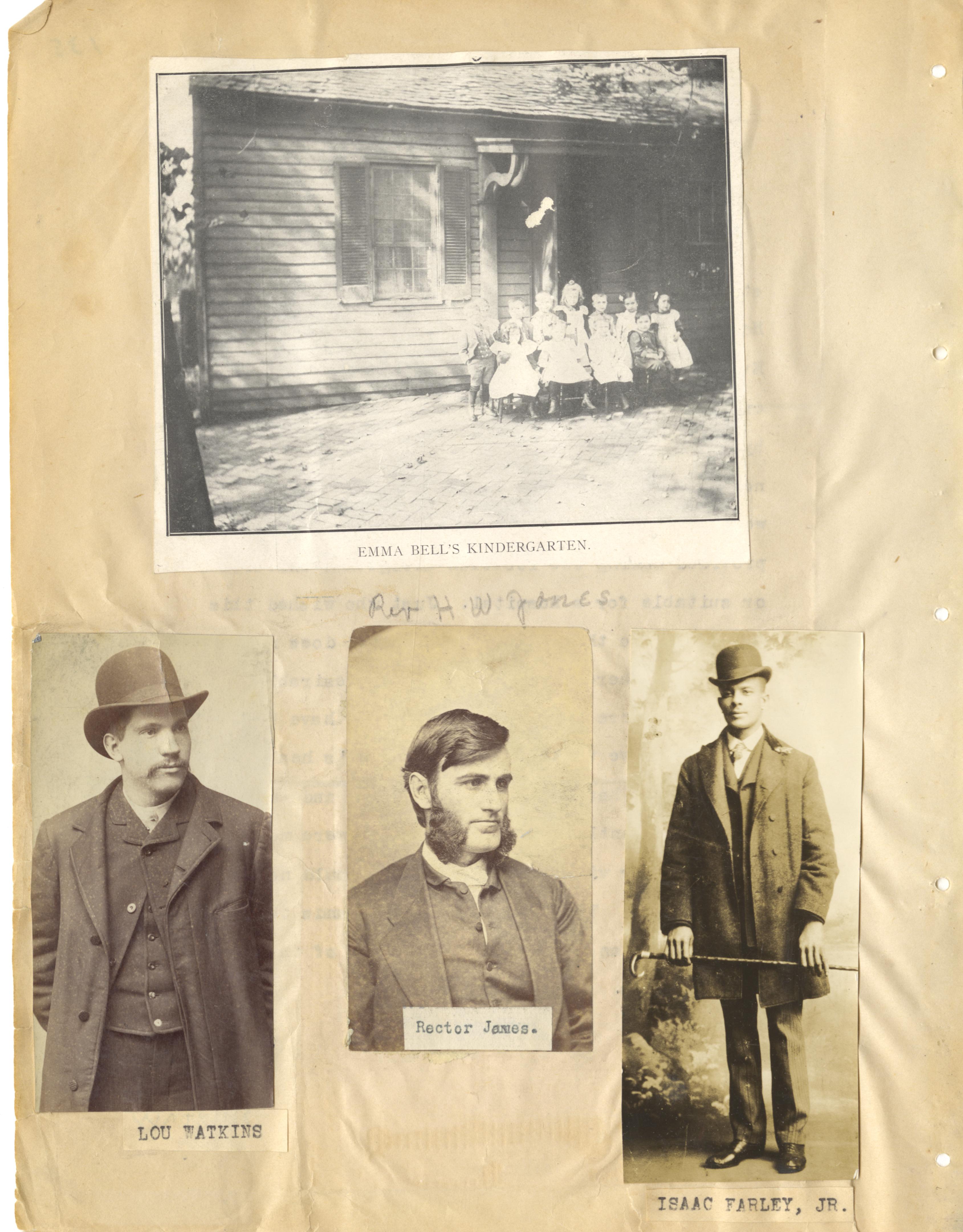 - Photo image of scanned scrapbook page: Emma Bell's Kindergarten, Lou Watkins, Rector Jones, Isaac Farley Jr.