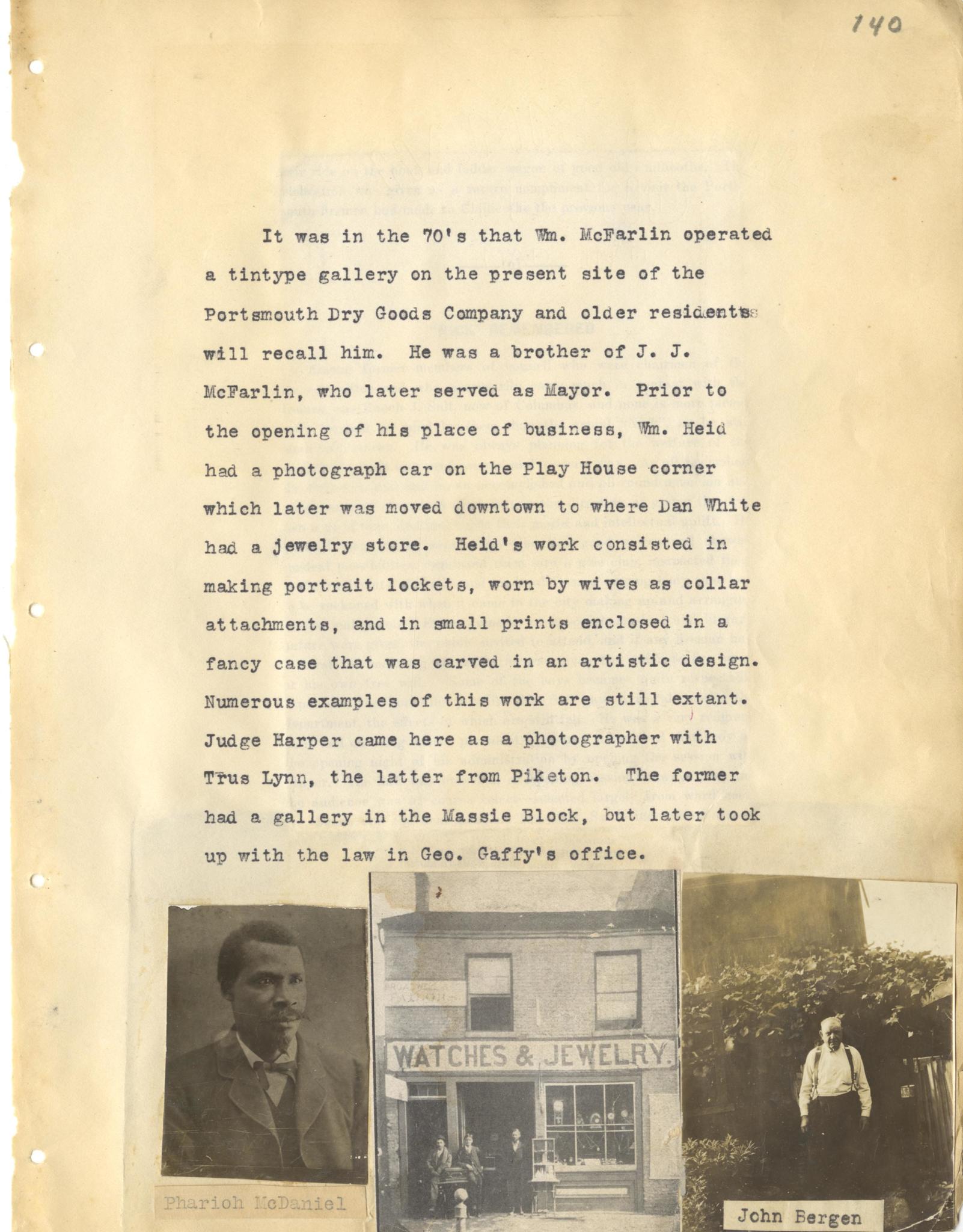 - Photo image of scanned scrapbook page: Typed page detailing local photographers that had shops in Portsmouth.