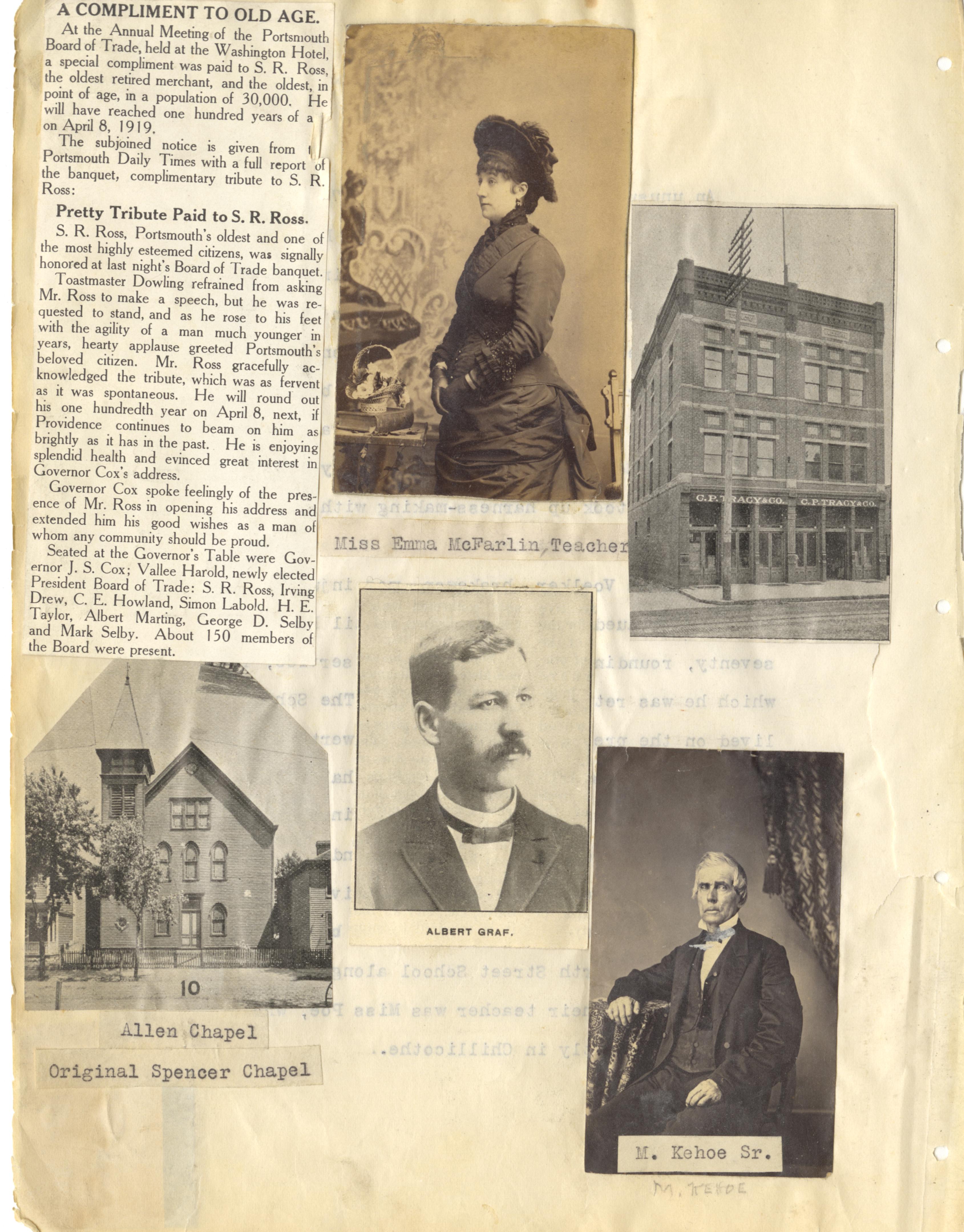 - Photo image of scanned scrapbook page: Meeting of the Portsmouth Board of Trade Article and Tribute Paid to S. R. Ross from newspaper.