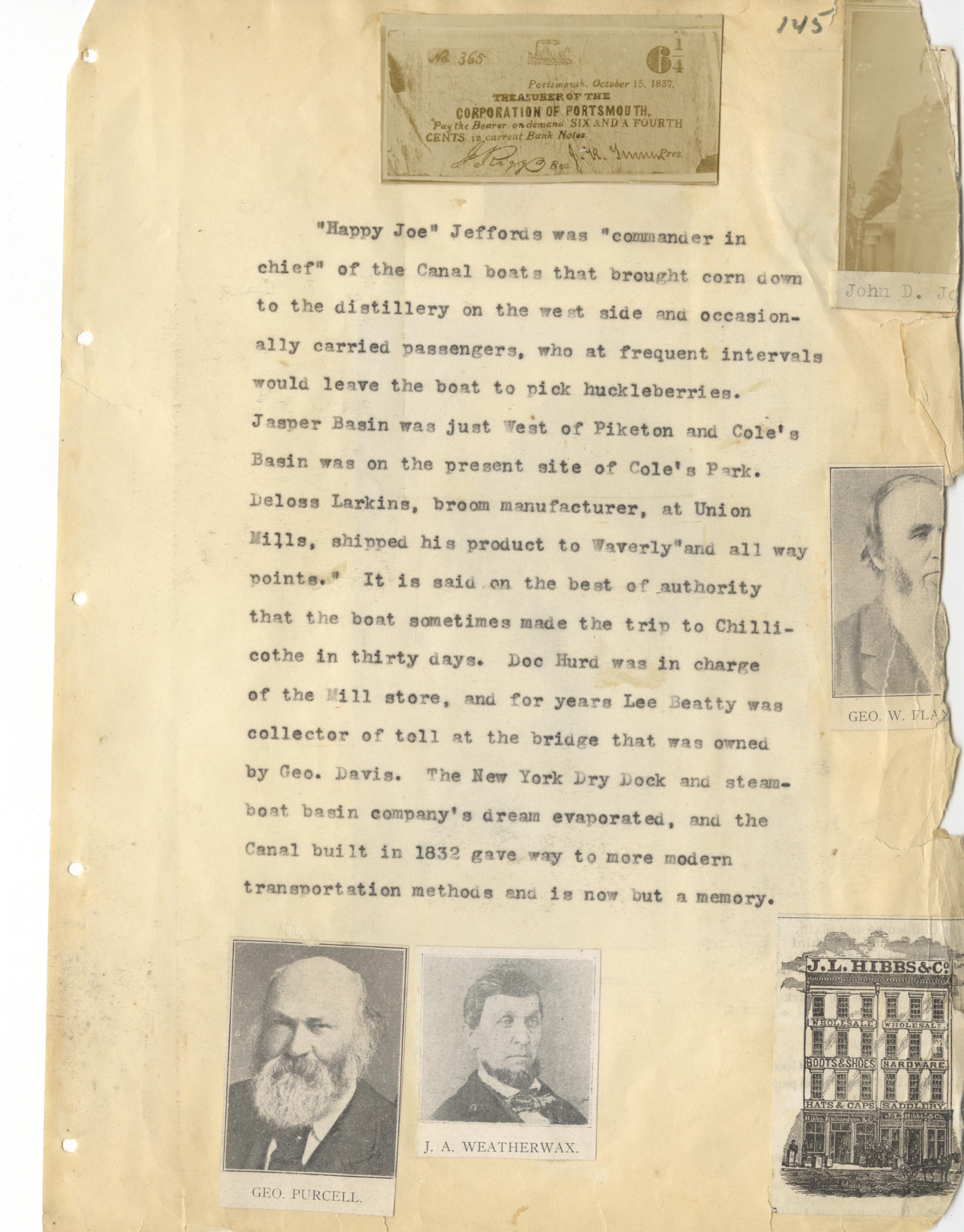 - Photo image of scanned scrapbook page: typed page giving information about "Happy Joe" Jeffords, commander of the canal boats that carried corn. Bank note from 1837, Geo Purcell, J. A. Weatherwax, John D. Flan, and J. L. Hibbs & Co. located on Sixth (6th) Street.