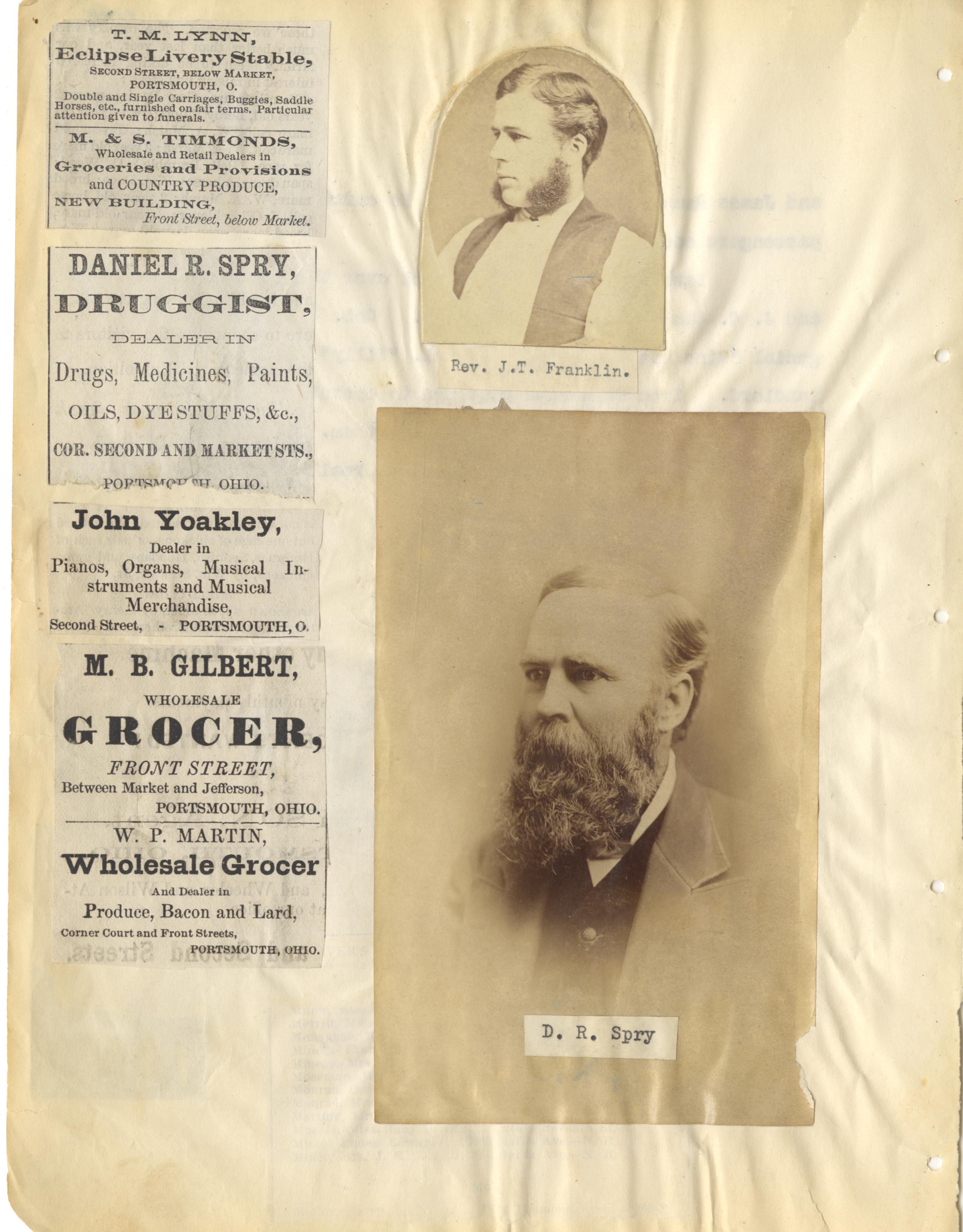 - Photo image of scanned scrapbook page. Pictured are Rev. J. T. Franklin and D. R. Spry with local business ads on the left