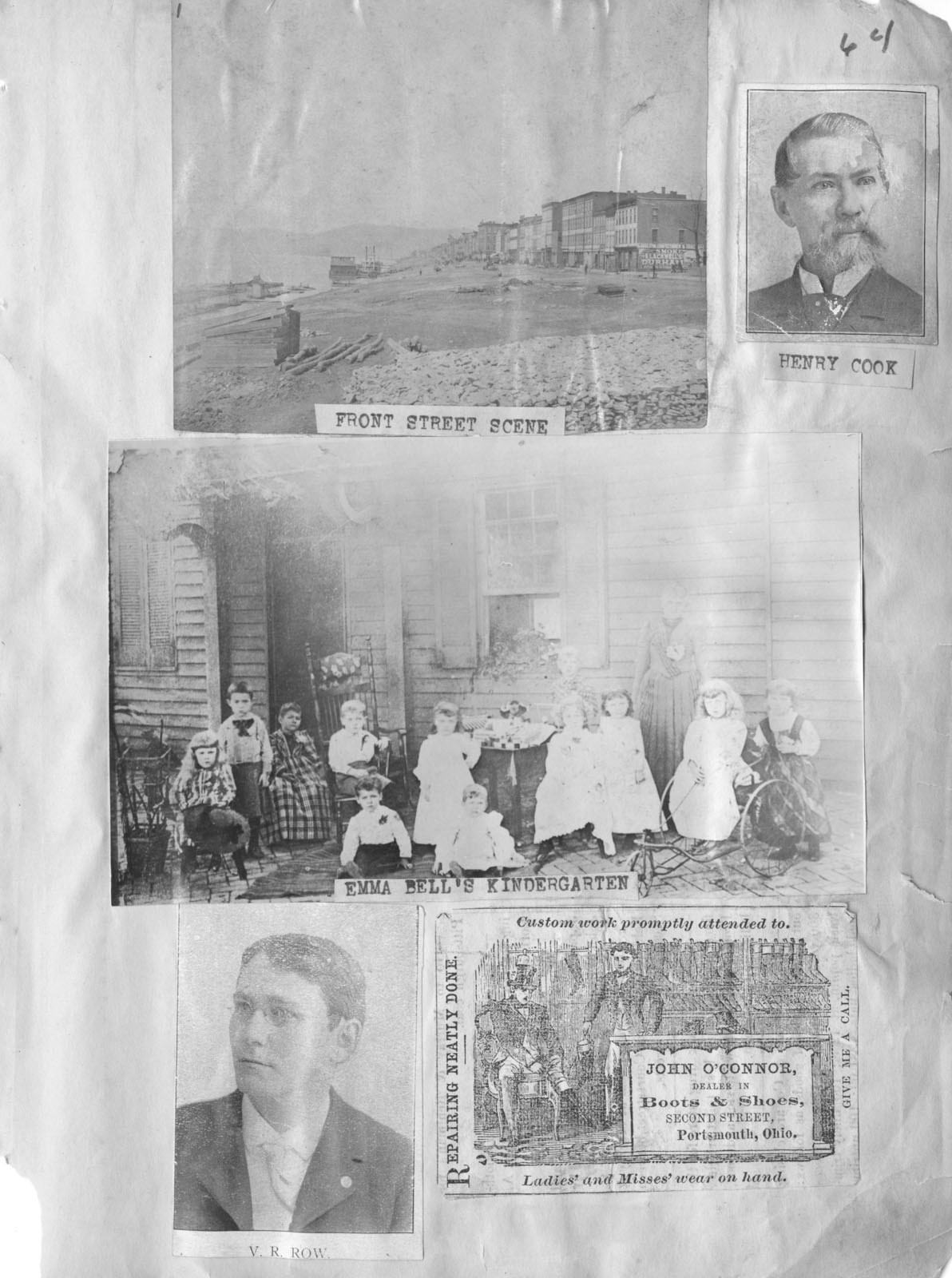 Henry A. Lorberg, “Front St. Scene; Henry Cook; Emma Bell's Kindergarten; V.R.Row; John O'Connor, Boots & Shoes,” Scioto County Public Library Local History Digital Collection, accessed December 6, 2025, https://www.sciotolibrary.org/history/items/show/2097.