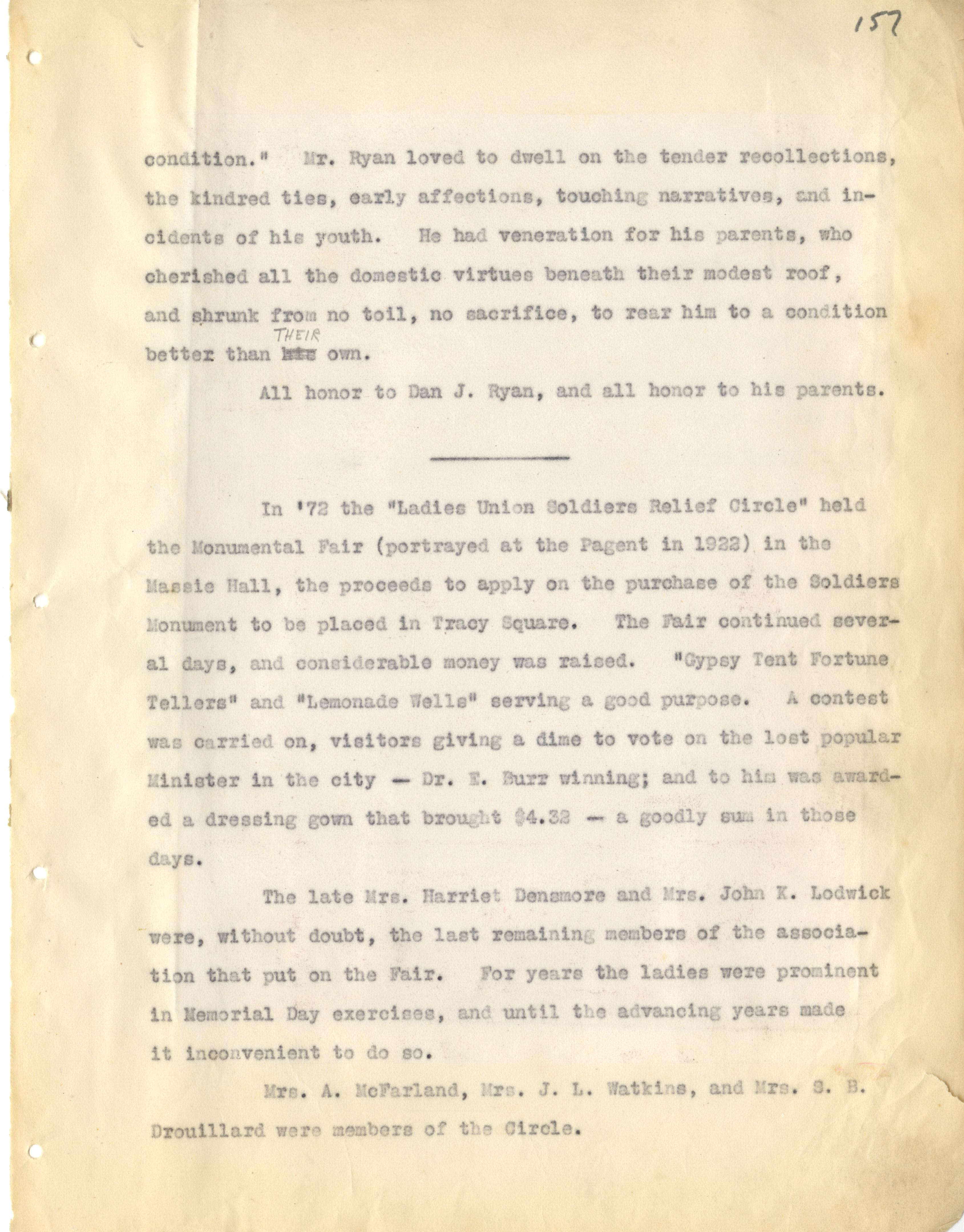 - Scanned page from scrapbook: typed page detailing the history of the Soldiers Monument in Tracy Park and the Ladies Union Soldiers Relief Circle