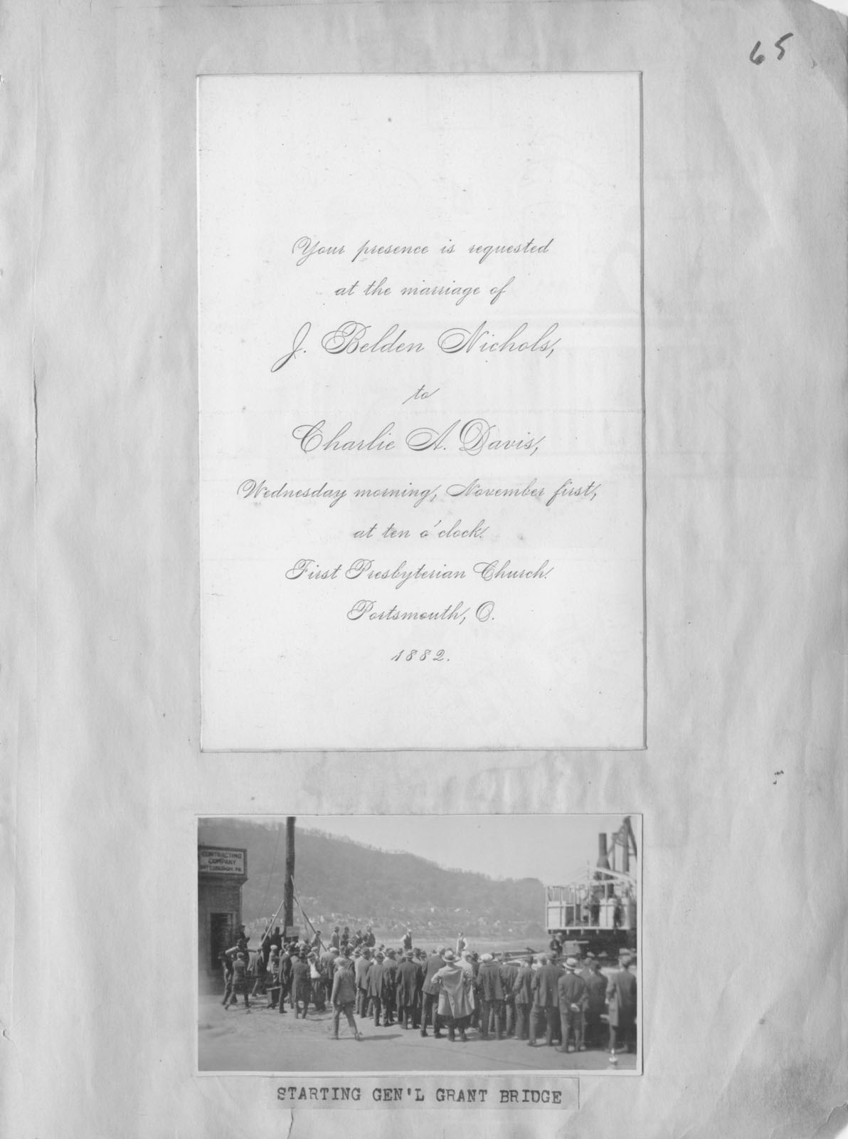 - Scanned page 65 from Henry A. Lorberg scrapbook containing a printed wedding invitation for the marriage of J. Belden Nichols to Charles A. Davis and a black & white image of General Grant Bridge.