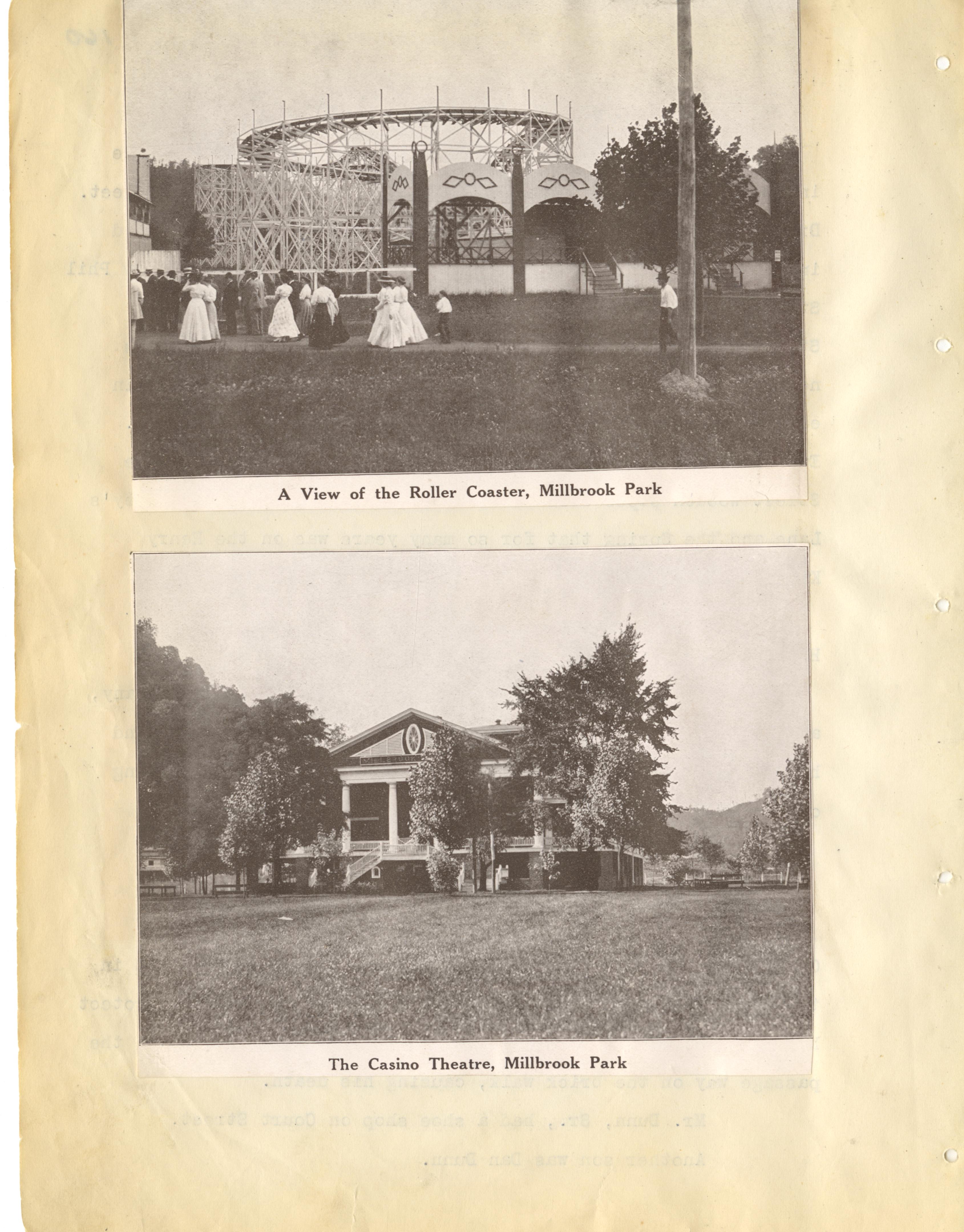 - Black and white photo image of page scanned from scrapbook: the Roller Coaster in Millbrook Park and the Casino Theatre