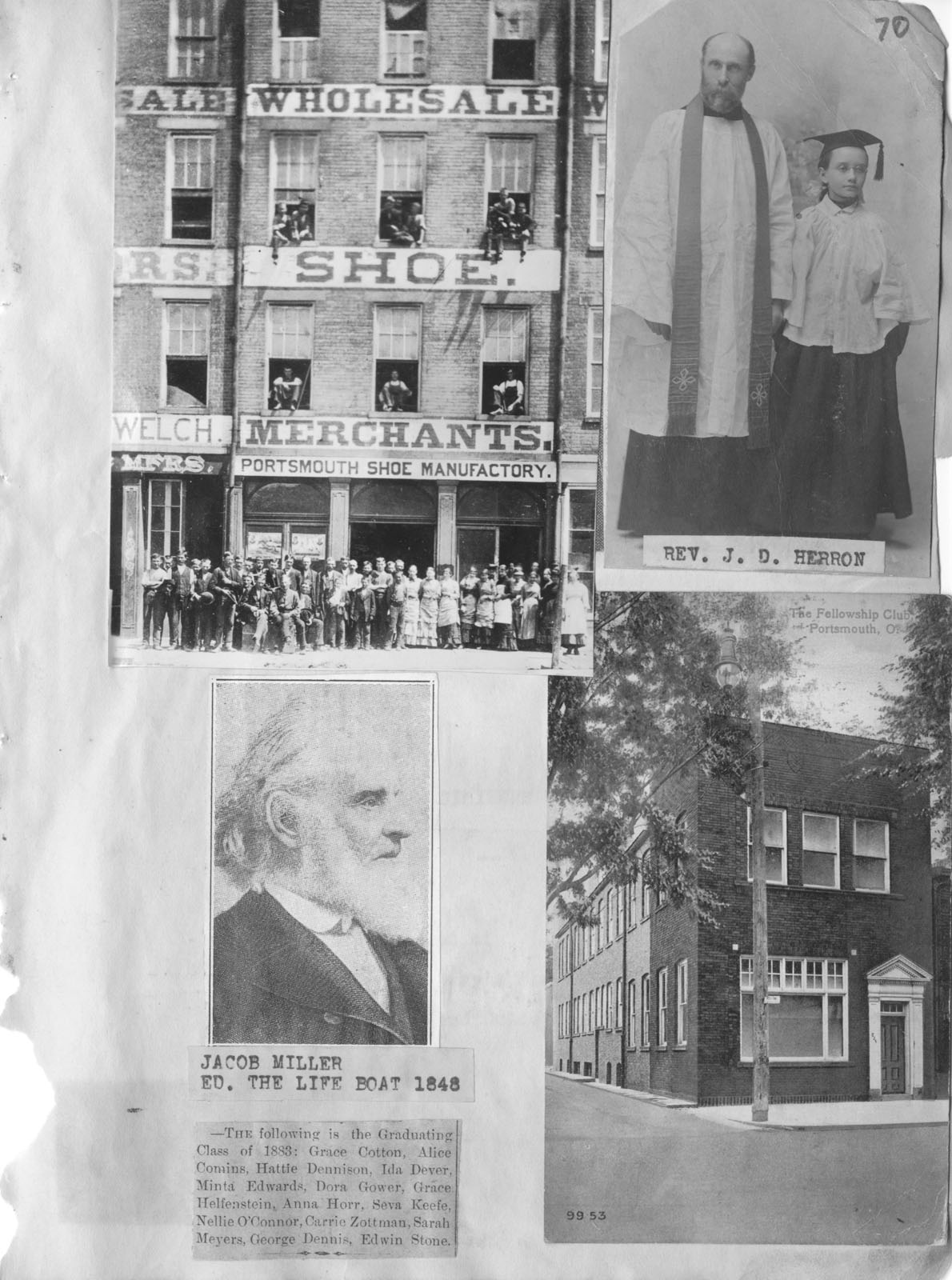 - Scanned page 70 from Henry A. Lorberg scrapbook containing black & white images of Portsmouth Shoe Manufactory at 127 W. Front St.' Rev. J. D. Herron and an unidentified girl; Jacob Miller, Ed. The Life Boat 1848; and The Fellowship Club. A newspaper clipping listing the graduating class of 1883: Grace Cotton, Alice Comins, Hattie Dennison, Ida Dever, Minta Edwards, Dora Gower, Grace Helfenstein, Anna Horr, Seva Keefe, Nellie O'Connor, Carrie Zottman, Sarah Meyers, George Dennis, and Edwin Stone.