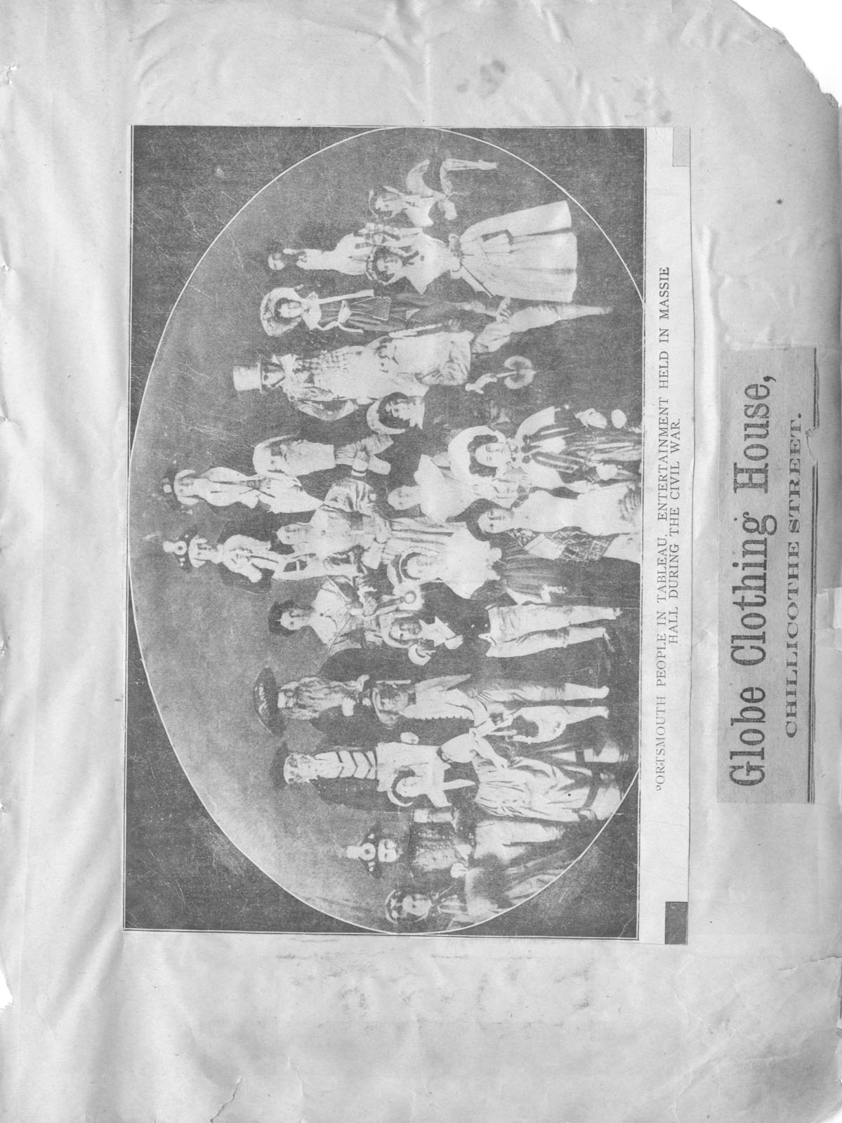 - Scanned unnumbered page from Henry A. Lorberg scrapbook containing black & white image captioned "Portsmouth People in Tableau. Entertainment held in Massie Hall during the Civil War." A print clipping for Globe Clothing House on Chillicothe Street.