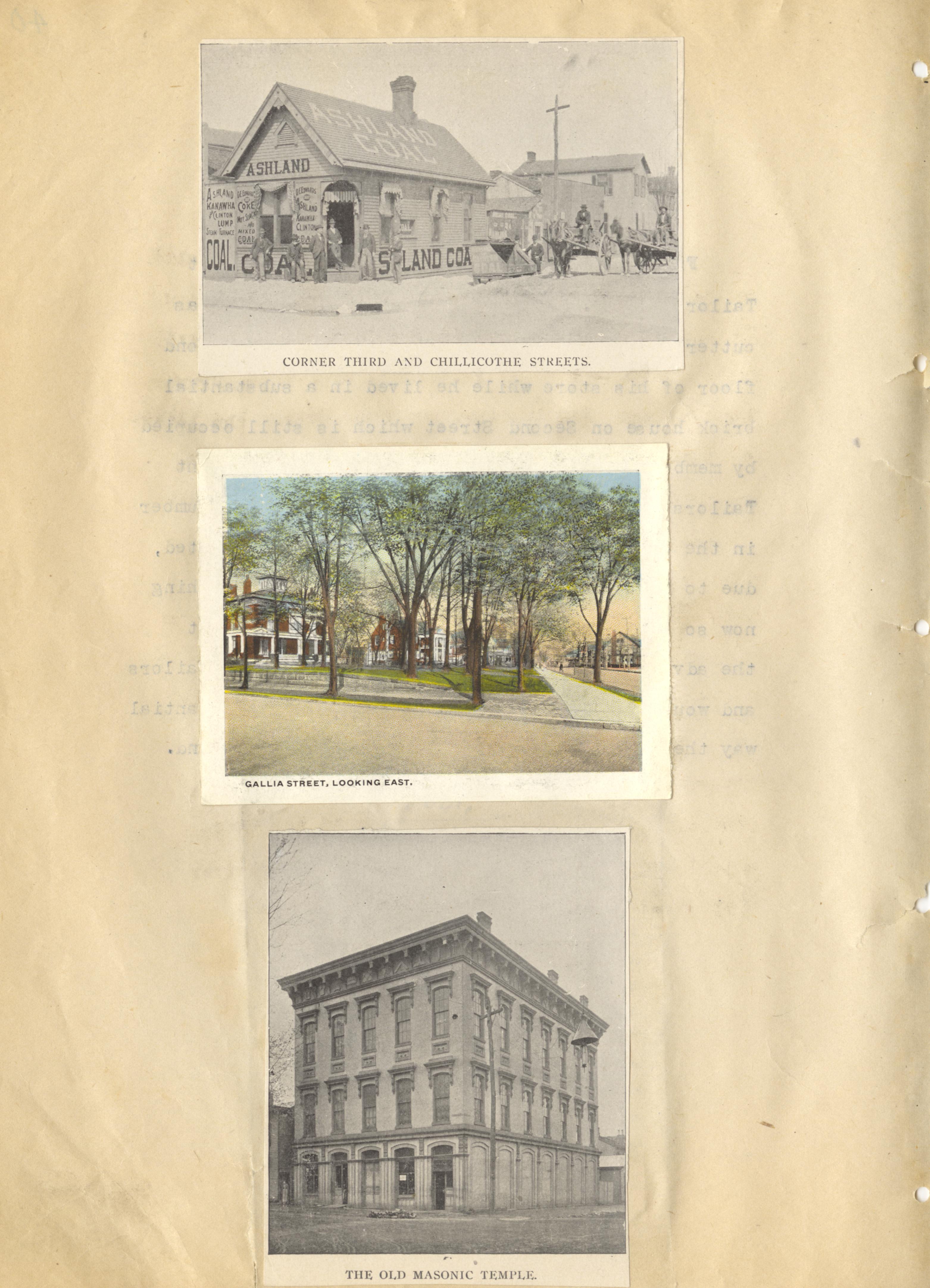 - Photo image of scanned scrapbook page. Pictured is three images: Corner Third (3rd) and Chillicothe Streets: Ashland Coal; Gallia Street, Looking East; Old Masonic Temple Building on the corner of Third (3rd) and Washington Streets.