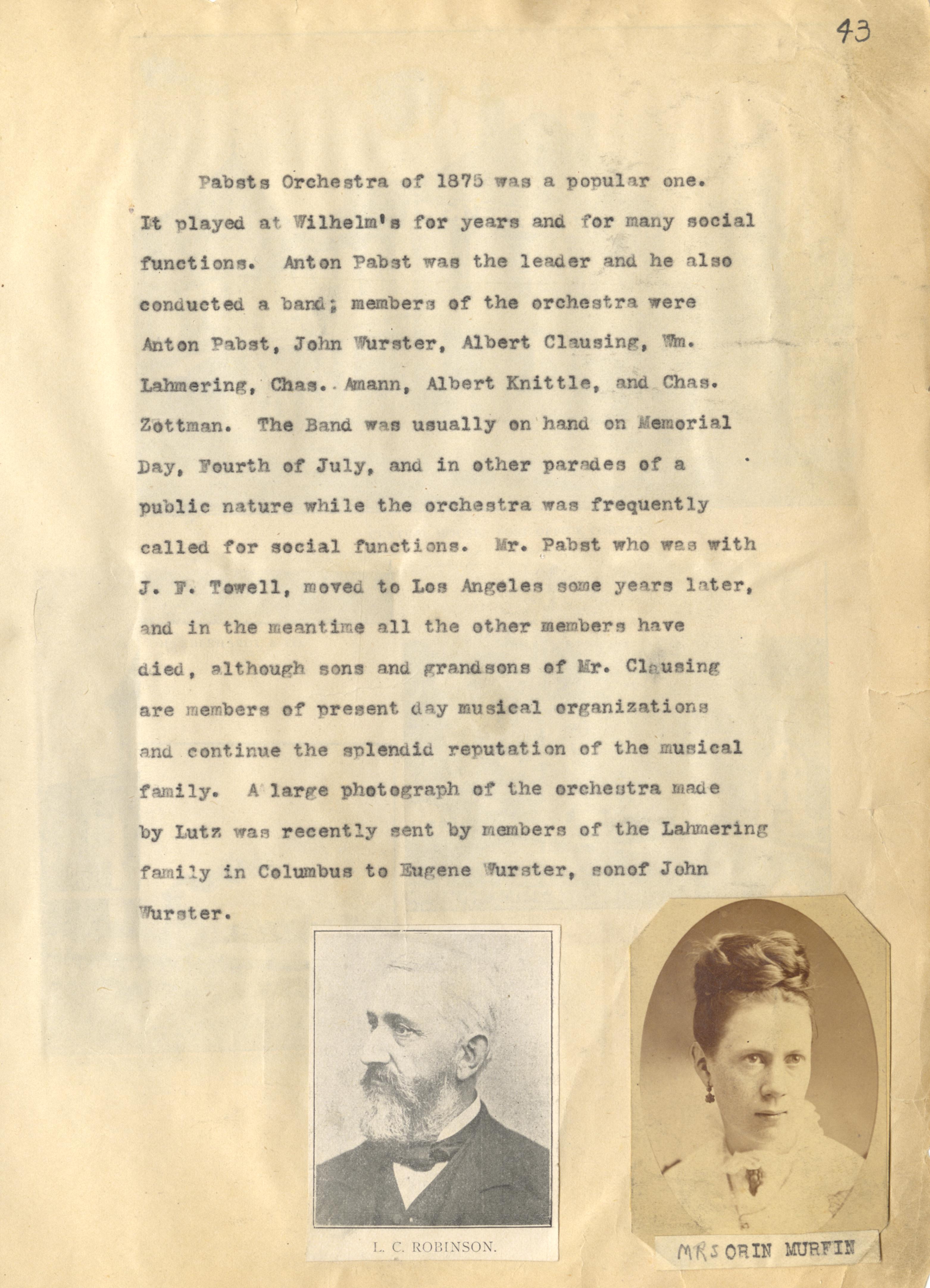 - Photo image of scanned scrapbook page. Pictured is a typed page giving information about the Pabst's Orchestra and events the group participated in. Anton Pabst; John Wurster; Albert Clausing; William Lahmering; Charles Amann; Albert Knittle; Charles Zottman; J. F. Towell; Mr. Clausing. Pictured: J. C. Robinson; Mrs. Orin Murfin