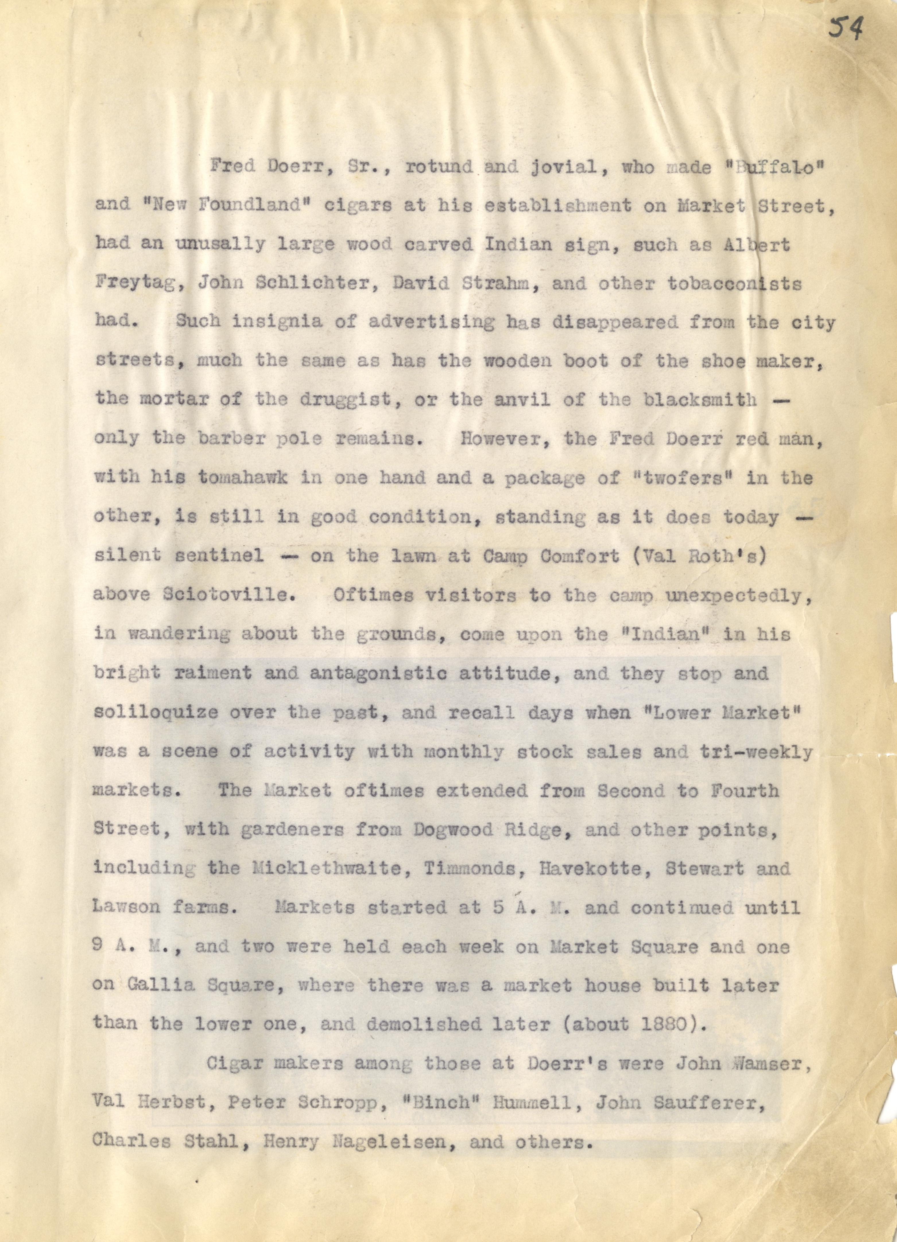 - Photo image of scanned scrapbook page. Pictured is a typed page giving information about Fred Doerr Sr.'s wooden indian sign. During the time that the sign was used, many businesses had forgone the usage of these types of advertisements. This made Doerr's sign a popular feature. He owned a cigar making shop on Market Street. Camp Comfort; Val Roth; Market Square; John Wamser; Val Herbst; Peter Schropp; Binch Hummell; John Saufferer; Charles Stahl; Henry Nageleisen