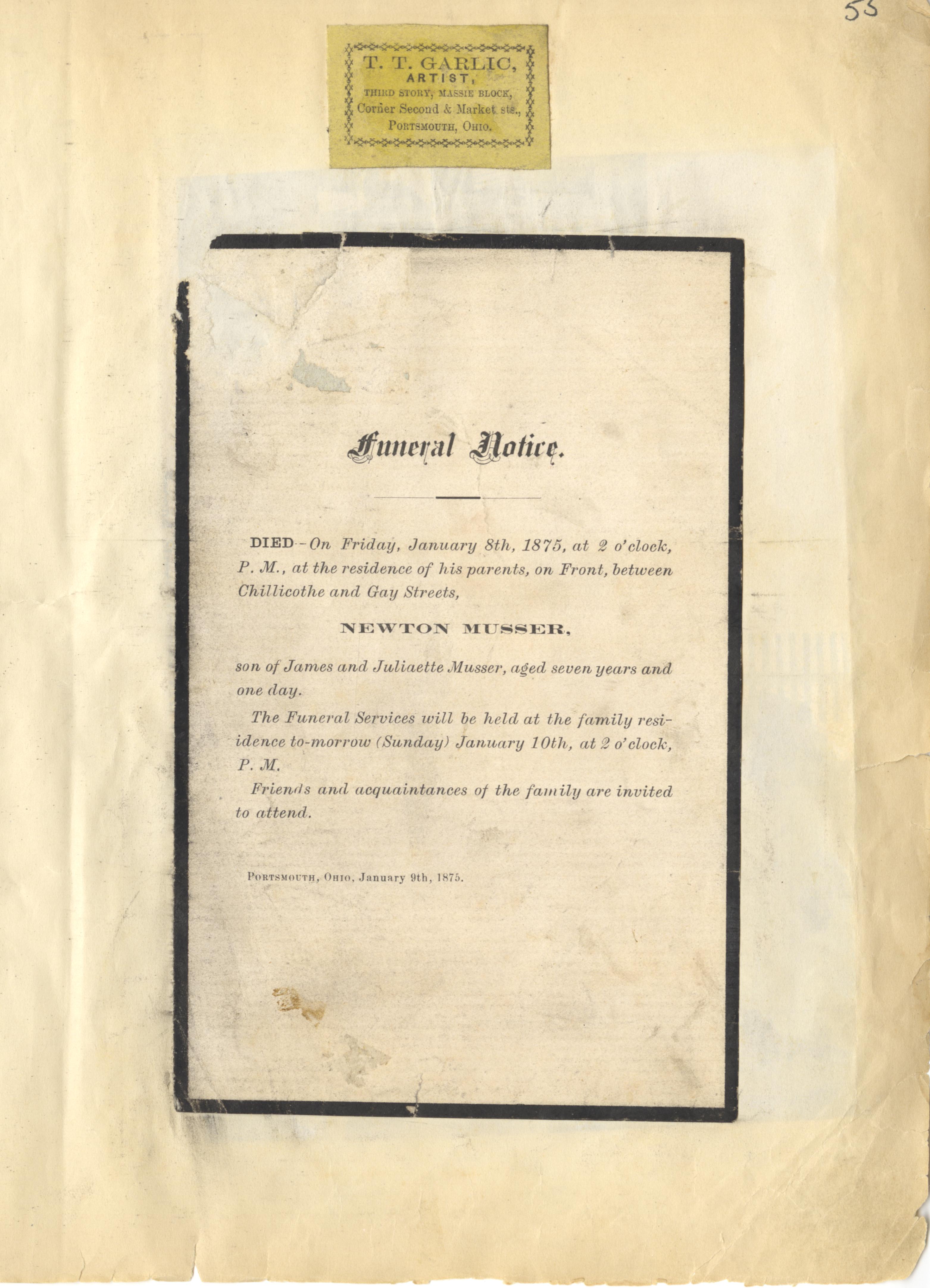 - Photo image of scanned scrapbook page. Pictured is a funeral notice for Newton Musser. He died January 8, 1875.