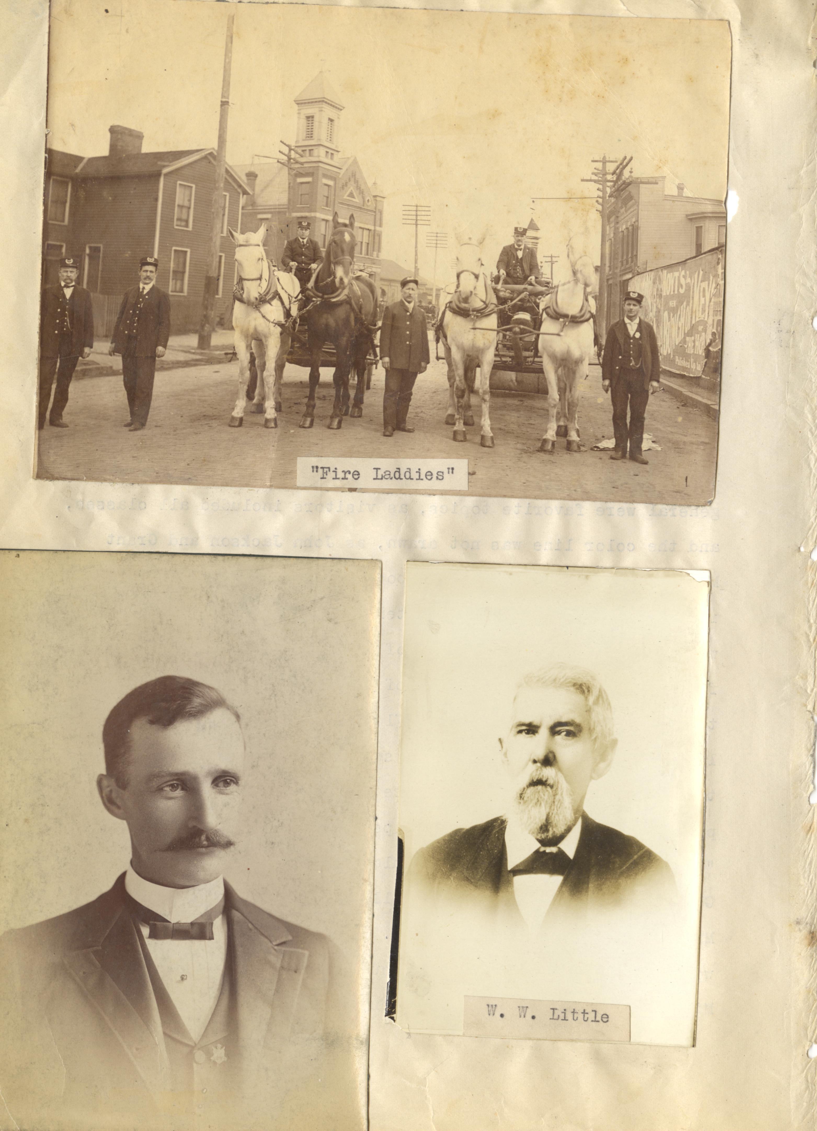 - Photo image of scanned scrapbook page. Pictured is three black and white photos: Fire Laddies; W. W. Little; and an unknown man