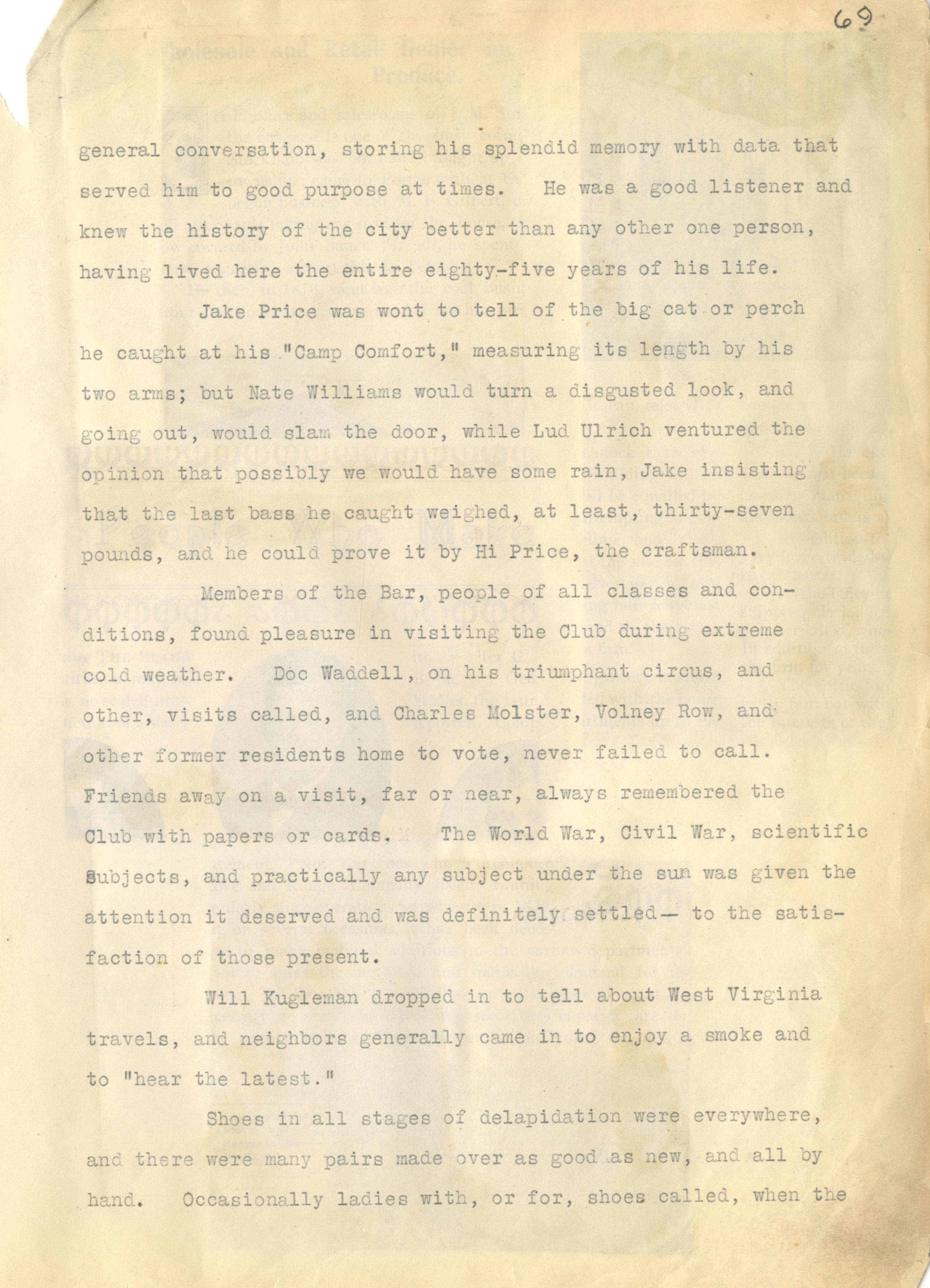 - Photo image of scanned scrapbook page. Pictured is a typed page giving information about local residents. Jake Price; "Camp Comfort;" Nate Williams; Lud Ulrich; Members of the Bar; Hi Price; Doc Waddell; Charles Molster; Volney Row; World War; Civil War; Will Kugleman