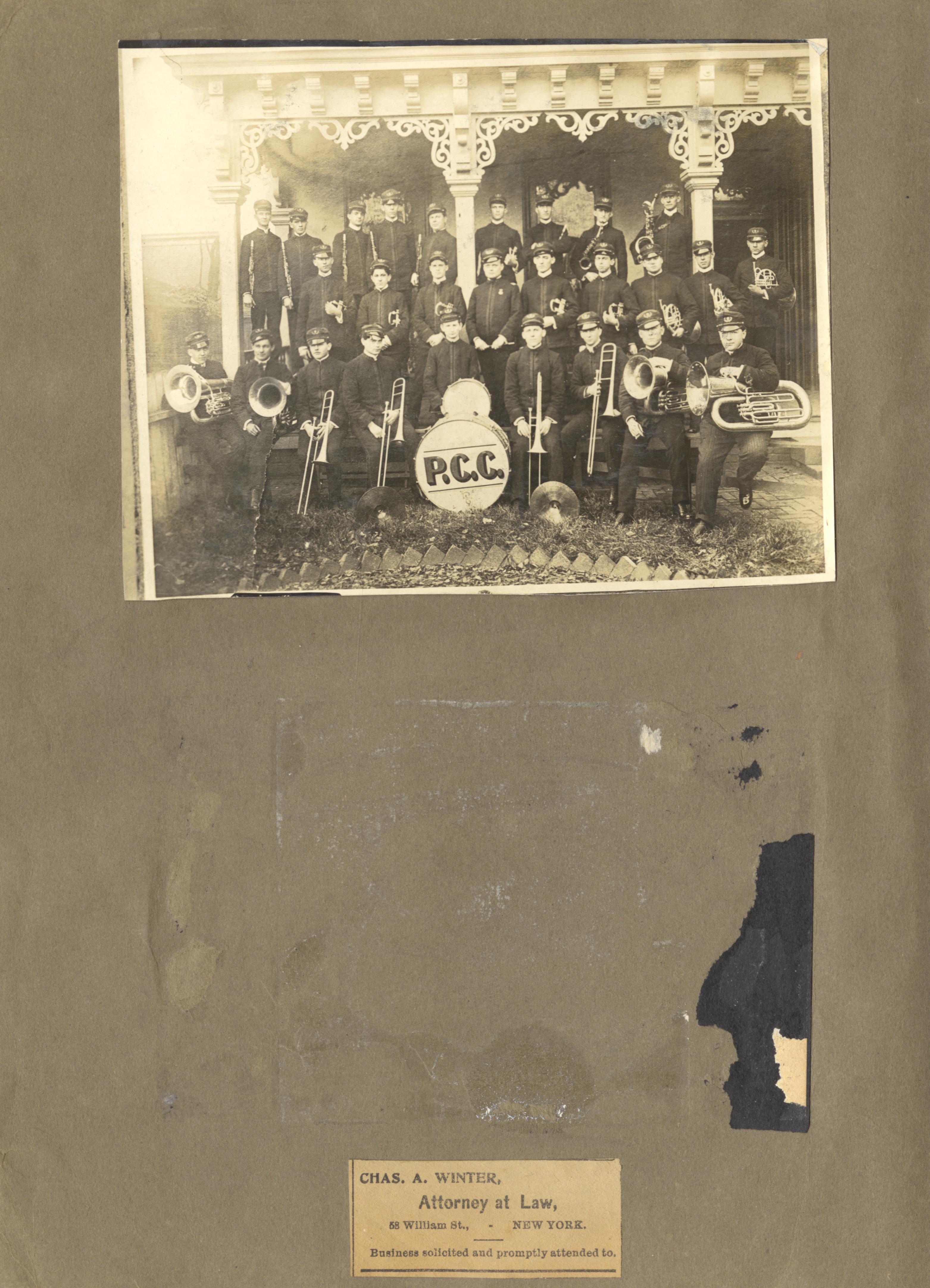 - Photo image of scanned scrapbook page. Pictured is a black and white photograph of the Portsmouth C. C. Band and a Business Card for Charles A. Winter, Attorney at Law at 58 Williams Street; Portsmouth C. C. Band
