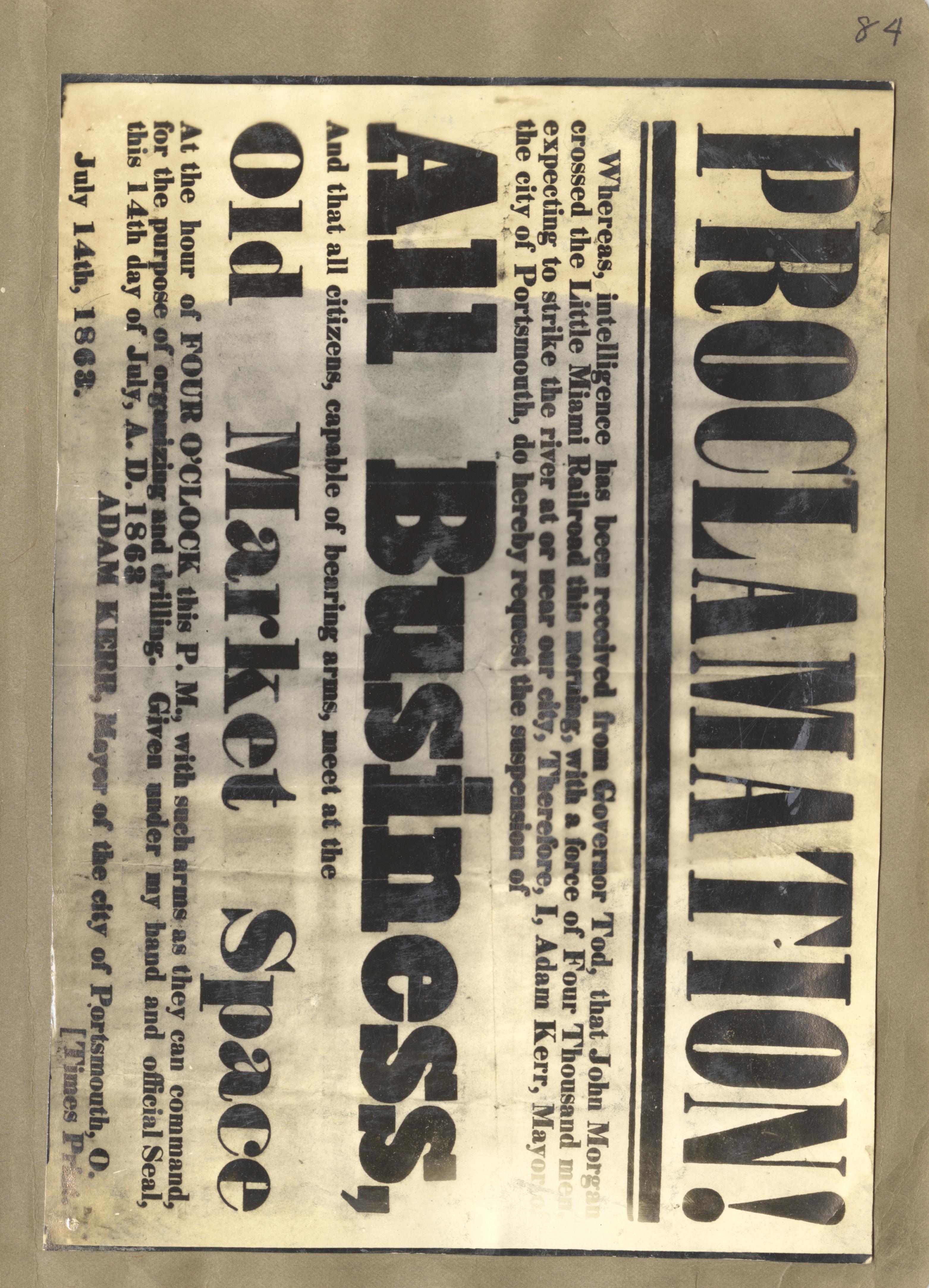 - Photo image of scanned scrapbook page. Pictured is a Proclamation for the Suspension of All Businesses and Citizens that can Bare Arms Meet at the Old Market Space on July 14, 1868. The proclamation was ordered by Mayor Adam Kerr