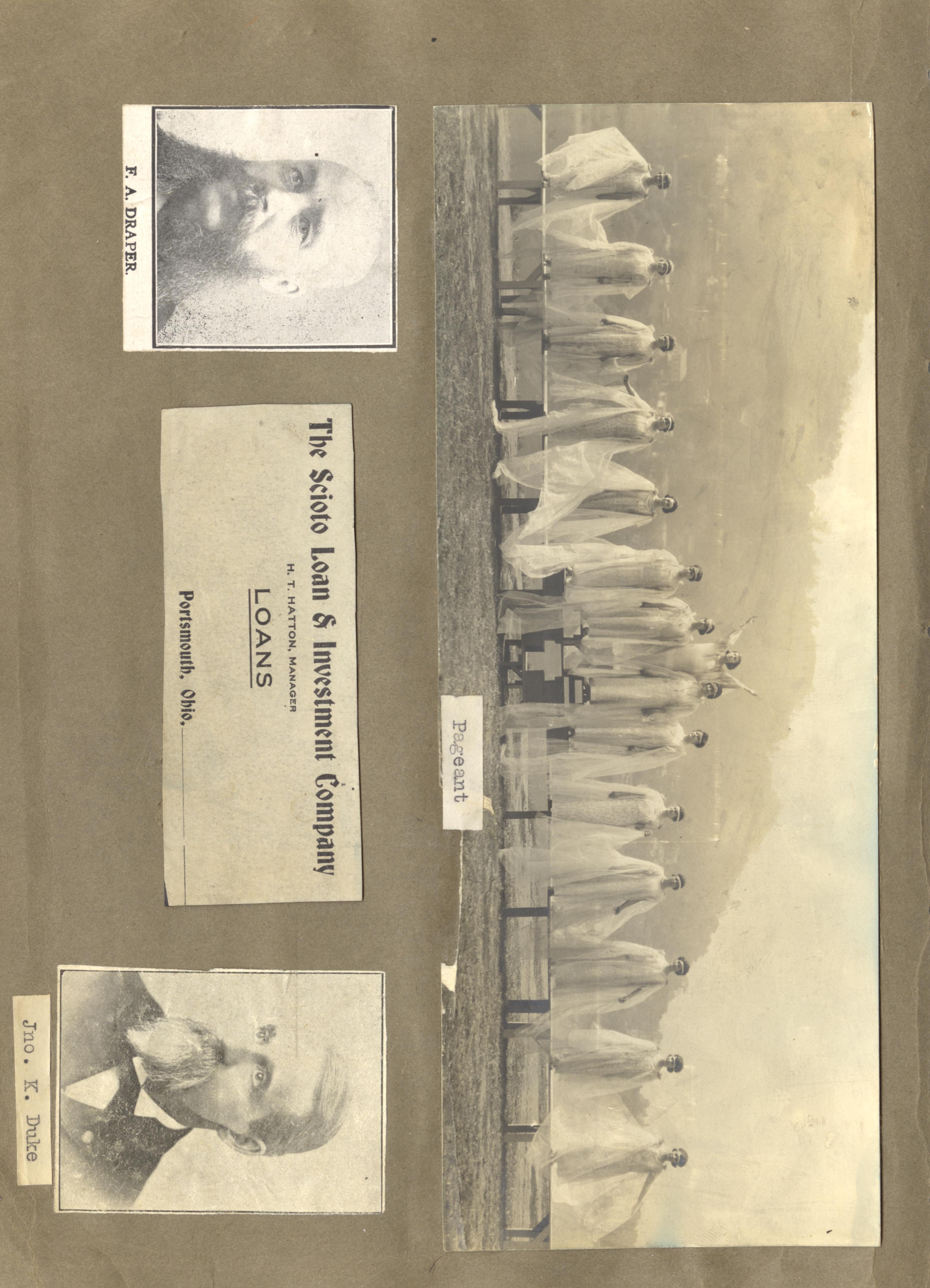 - Photo image of scanned scrapbook page. Pictured is a black and white Pageant Picture; F. A. Draper; John K. Duke; Ad for the Scioto Loan & Investment Company