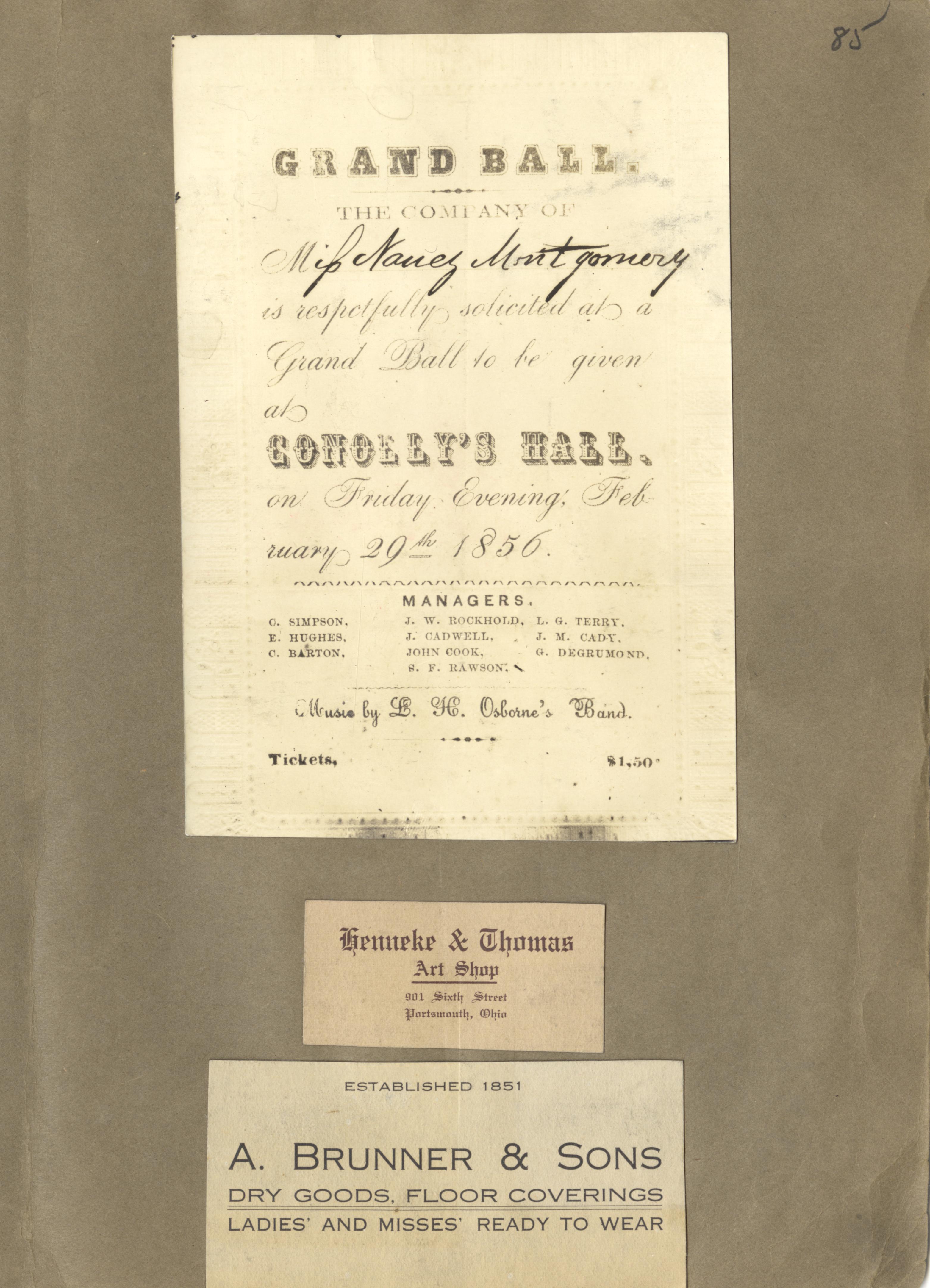 - Photo image of scanned scrapbook page. Pictured is a Grand Ball Invitation at Conolley's Hall on February 29, 1856; Business Card for Henneke & Thomas Art Shop at 901 Sixth (6th) Street; Business Card for A. Brunner & Sons Business