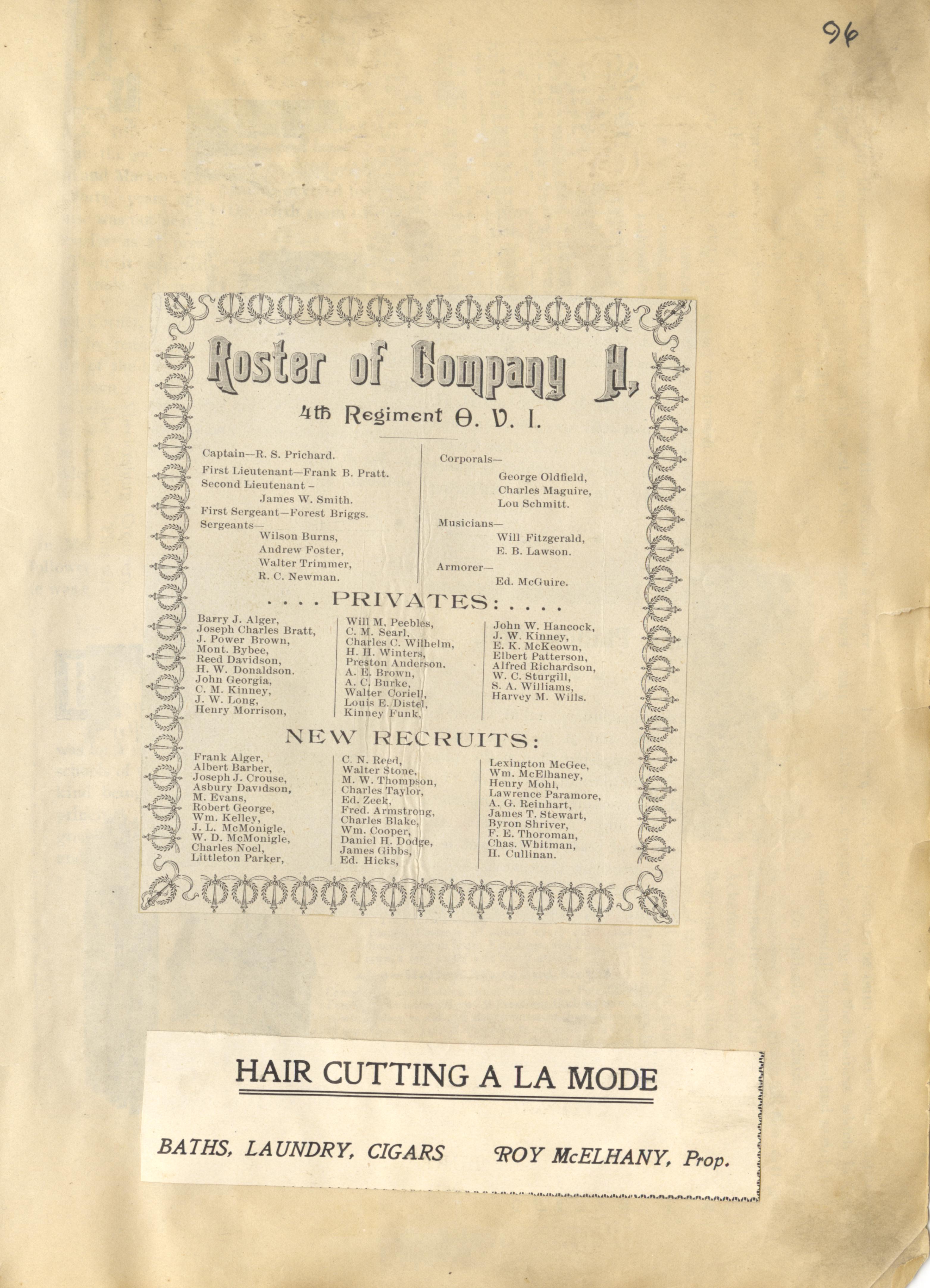 - Photo image of scanned scrapbook page. Pictured is a Roster of Company H of the 4th Regiment of the Ohio Volunteer Infantry; Ad for Hair Cutting A La Mode, Proprietor: Roy McElhany