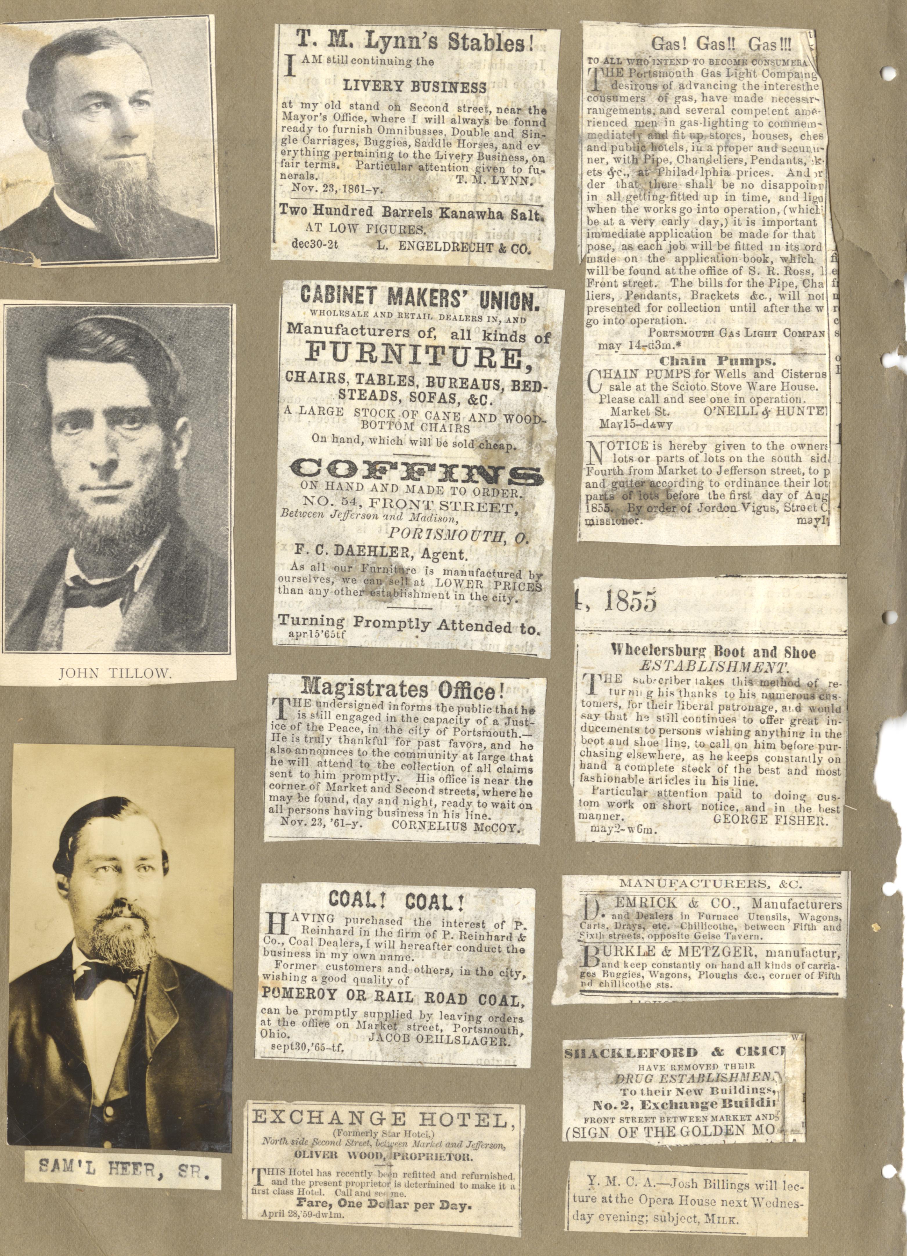 - Photo image of scanned scrapbook page. Pictured is John Tillow; Samuel Heer Sr.; Scioto County business ads