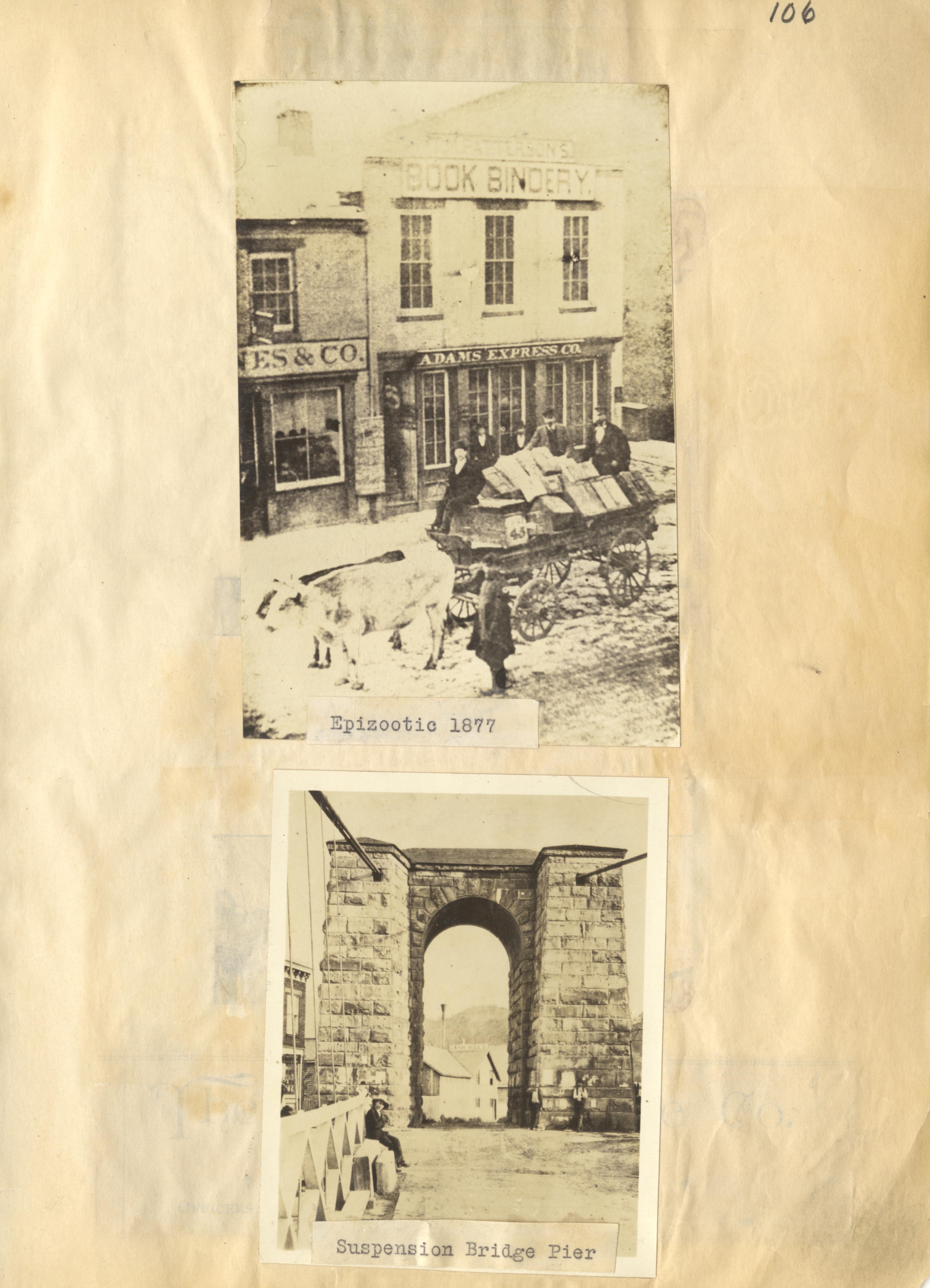 - Photo image of scanned scrapbook page. Pictured is the Epizootic in 1877 with the Adam Express Company and T. M. Book Bindery in the background. The Adams Express Company had to replace the horses with oxen to make their deliveries. Pictured below: the Suspension Bridge Pier