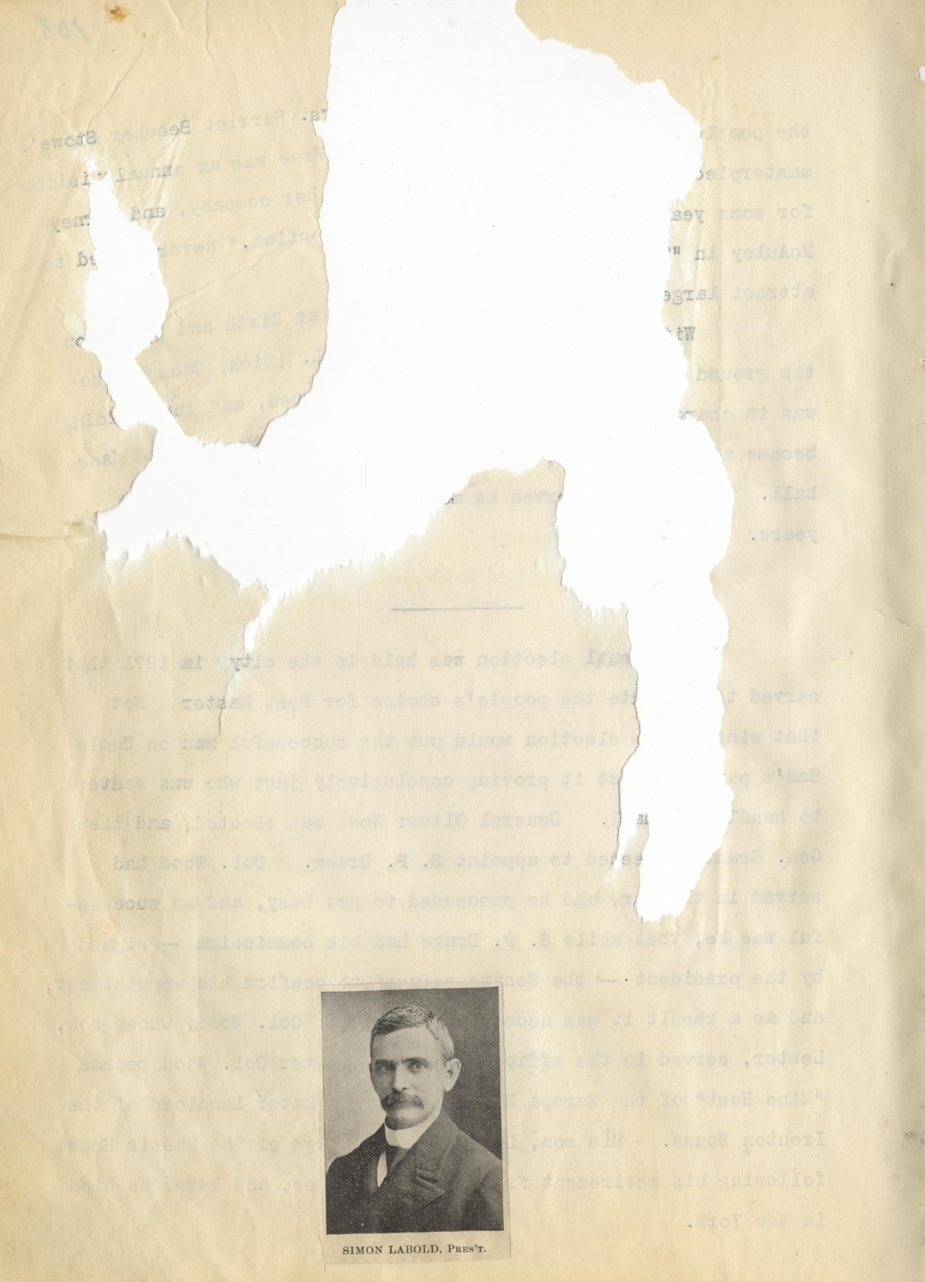 - Photo image of scanned scrapbook page. Pictured is page with faded text and Simon Labold. He was a prominent Portsmouth citizen, involved in many organizations within the city. He married Sophie Riesman in 1886.