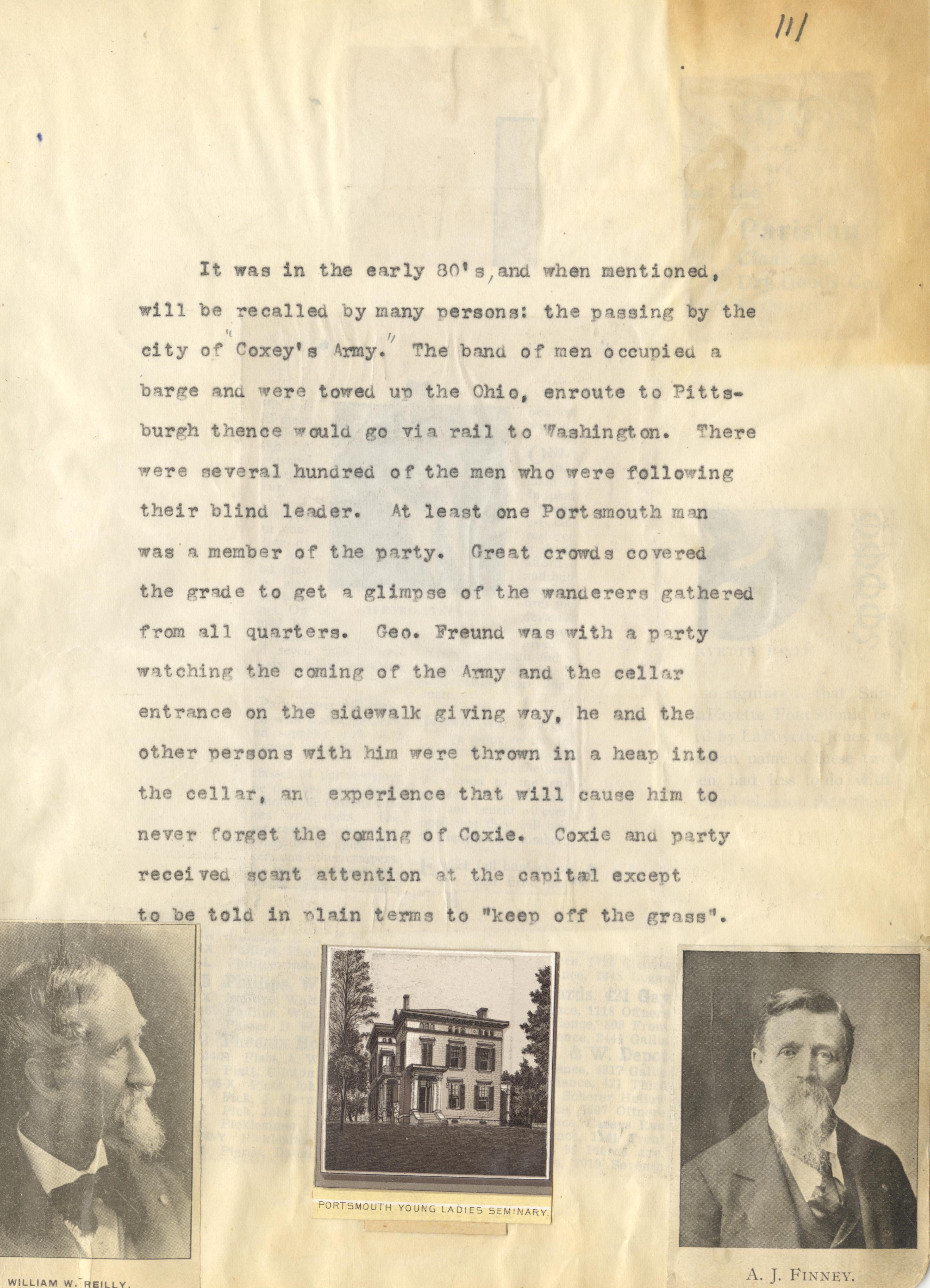 - Photo image of scanned scrapbook page. Pictured is a typed page giving details about when Coxey's Army Passed by Portsmouth; William W. Reilly; A. J. Finney; Portsmouth Young Ladies Seminary.