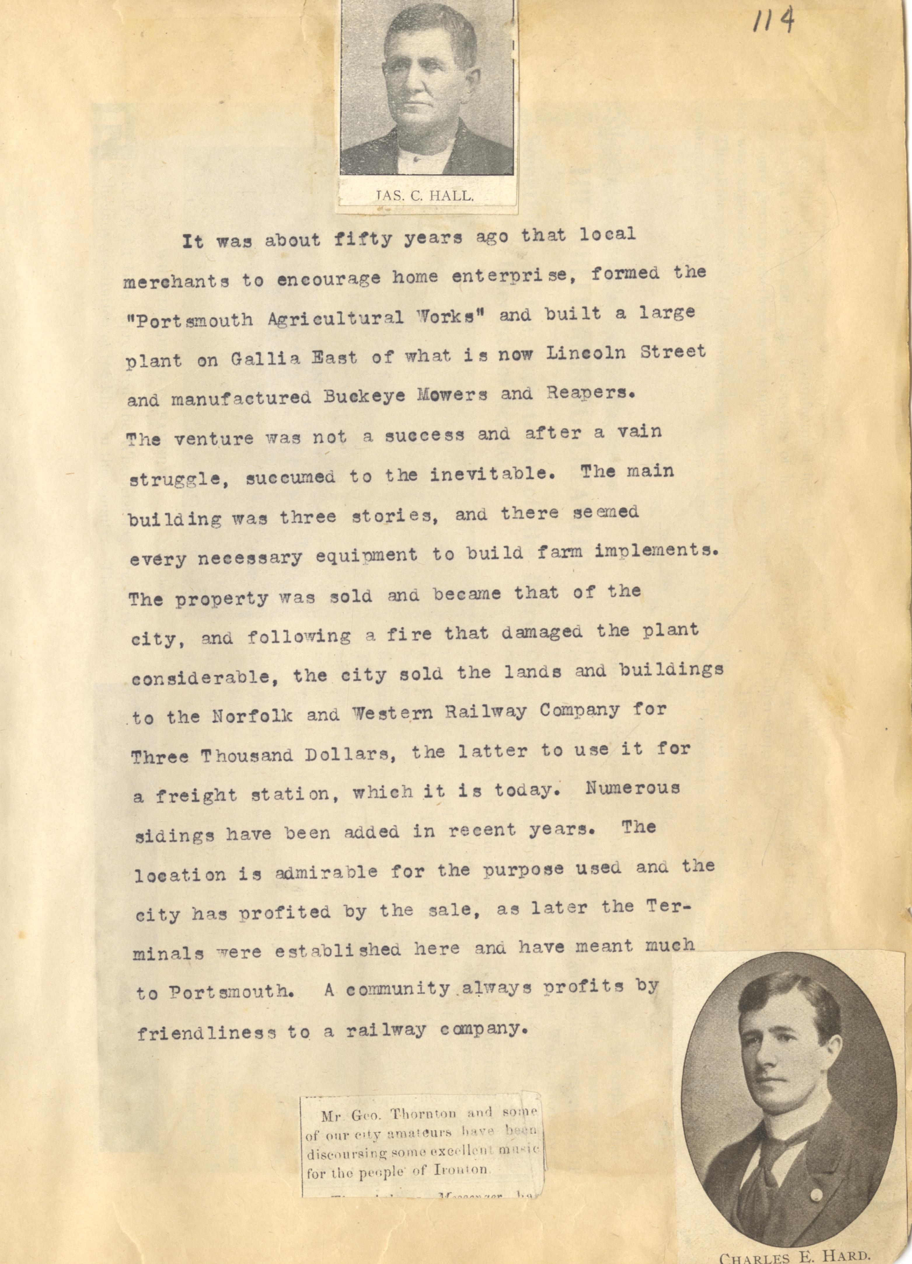 - Photo image of scanned scrapbook page. Pictured is a typed page with history and information about the Portsmouth Agricultural Works. Pictured is Jas. C. Hall and Charles E. Hard. Portsmouth Agricultural Works; Buckeye Mowers and Reapers; Norfolk and Western Railroad Company