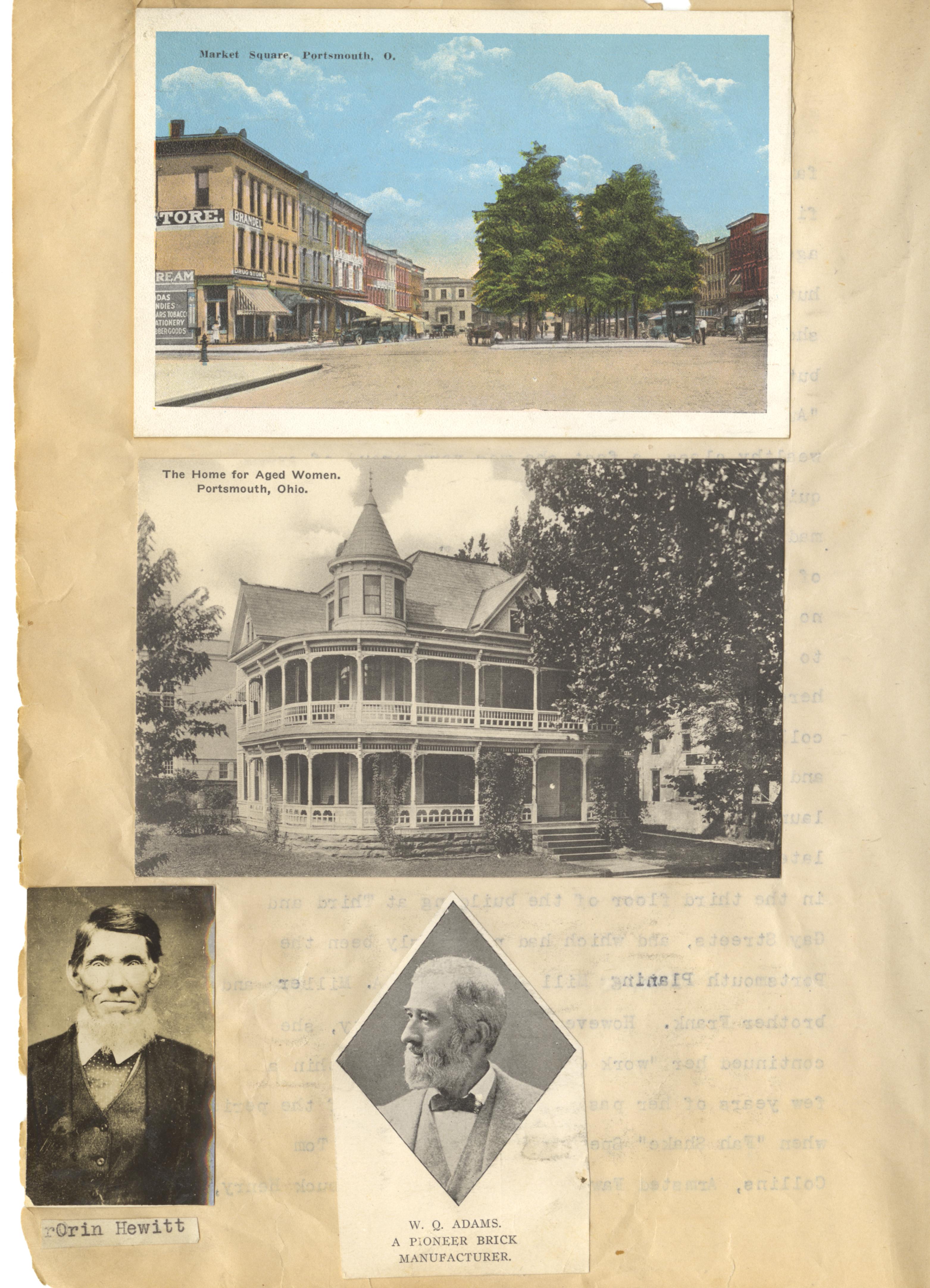 - Photo image of scanned scrapbook page. Pictured: Market Square, Portsmouth, O.; Home for Aged Women; Orin Hewitt; W. Q. Adams, a pioneer brick manufacturer