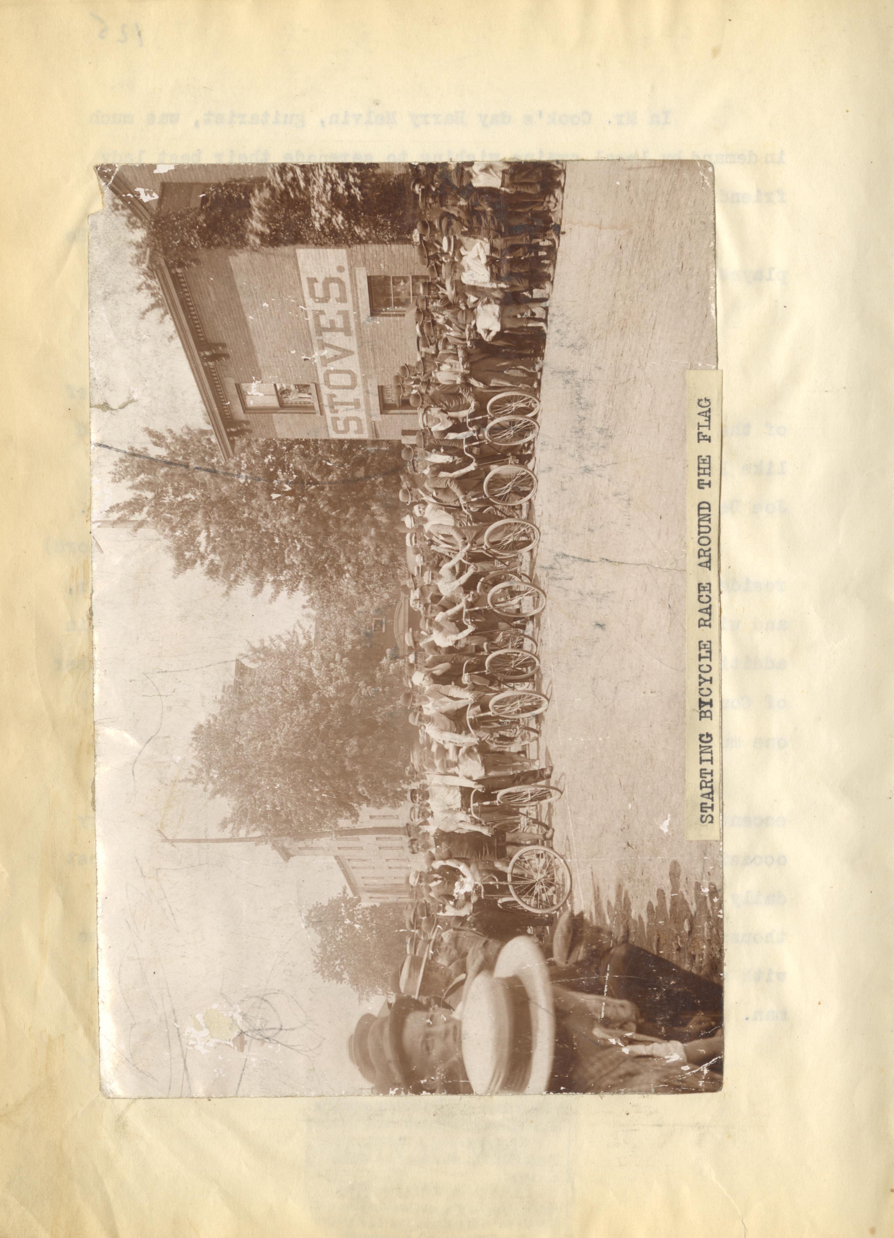 - Photo image of scanned scrapbook page. Pictured is a black and white photo of cyclists at the start of a bicycle race around the flag in Portsmouth.