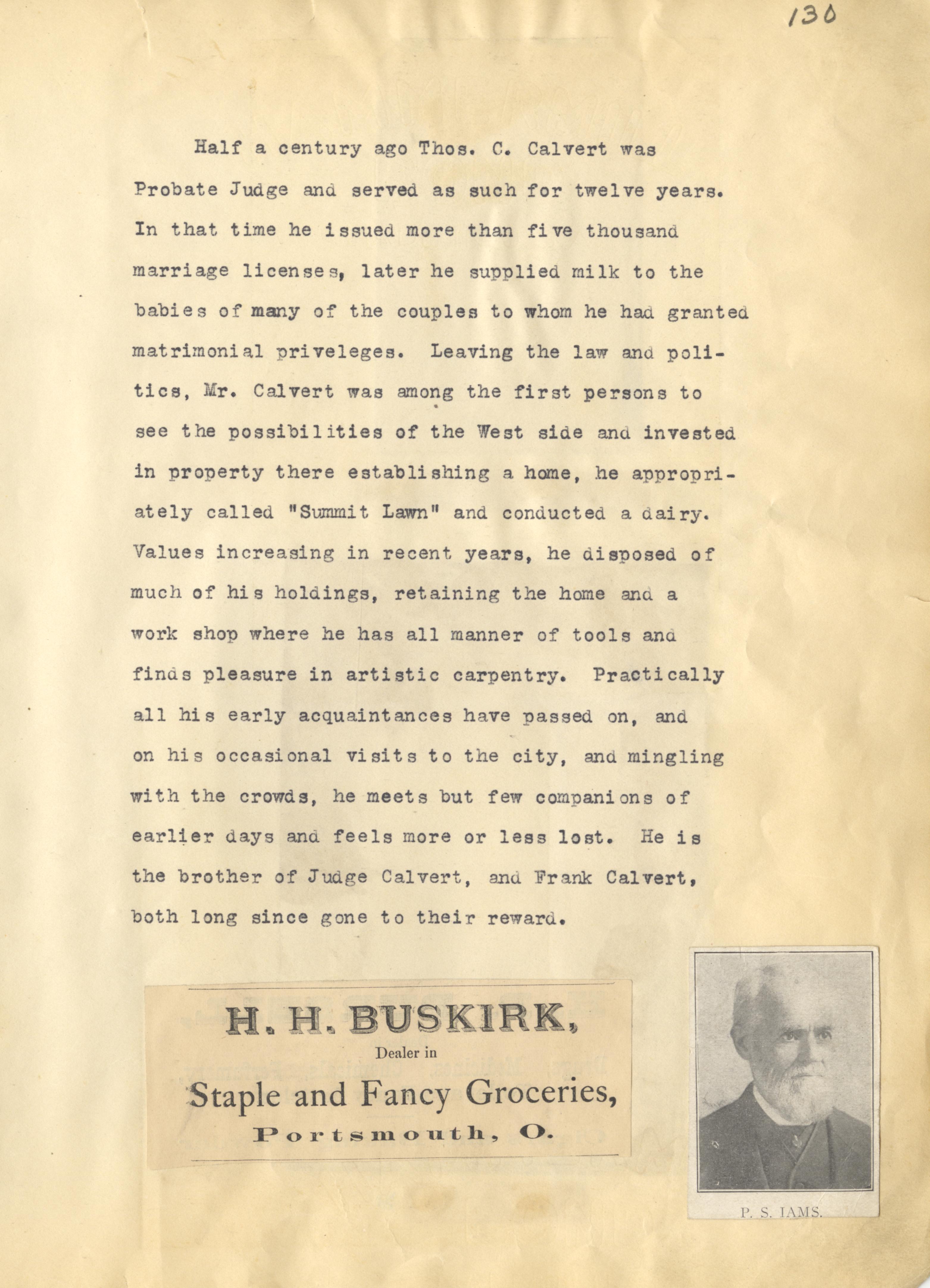 Henry A. Lorberg , “Thomas C. Calvert and Family; P. S. Iams; Ad for H. H. Buskirk, Dealer in Staple and Fancy Groceries,” Scioto County Public Library Local History Digital Collection, accessed December 14, 2025, https://www.sciotolibrary.org/history/items/show/21346.