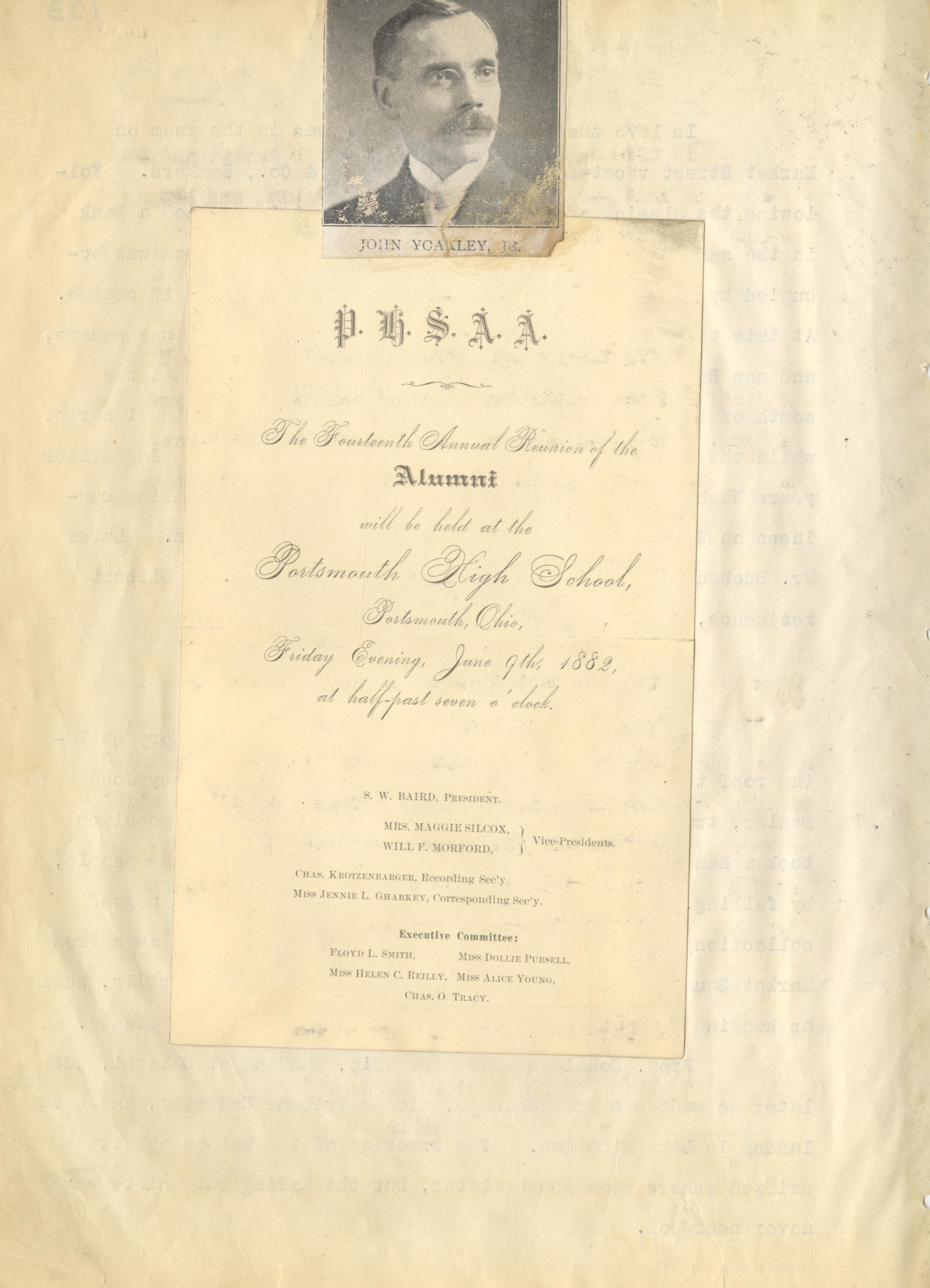 Henry A. Lorberg , “John Yoakley Jr.; Program for the Portsmouth High School Alumni on June 9, 1882,” Scioto County Public Library Local History Digital Collection, accessed December 13, 2025, https://www.sciotolibrary.org/history/items/show/21353.