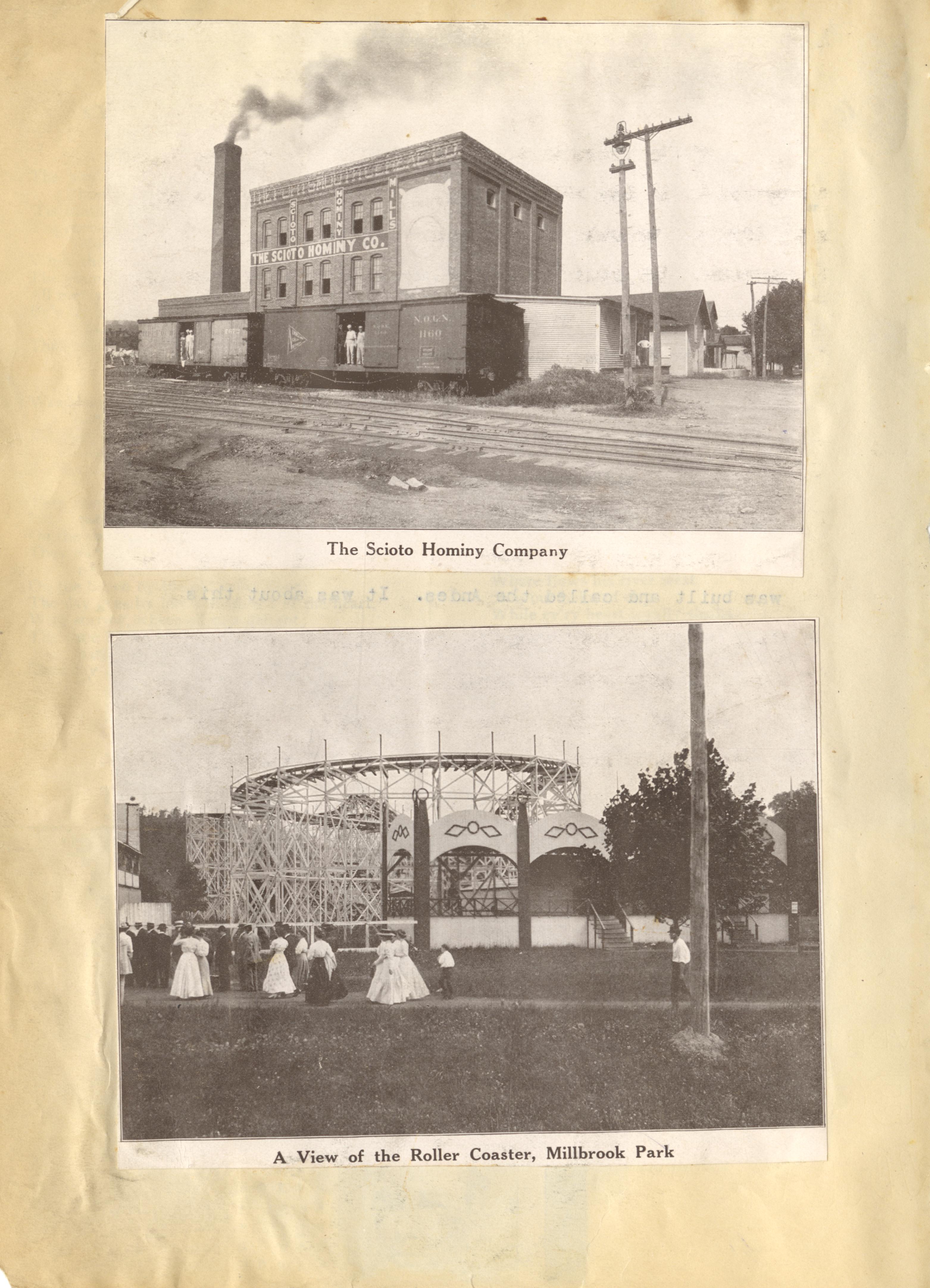 - Photo image of scanned scrapbook page. Pictured is the the Scioto Hominy Company on Gay Street; View of Roller Coaster, Millbrook Park. Levi York began developing the 85 acre park in 1899. It was severely damaged by the flood and was totally dismantled in 1935. Both images cut from a page in Pictorial Portsmouth.