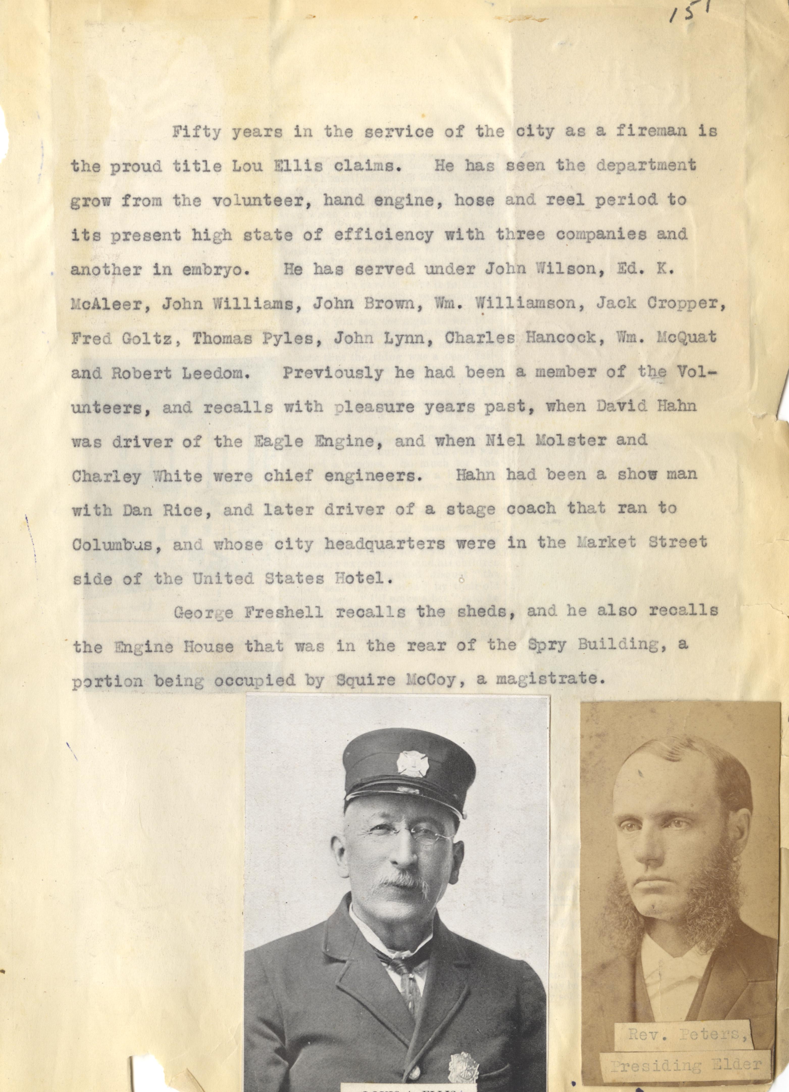 - Photo image of scanned scrapbook page 151. Pictured is a typed page giving details about Fireman Lou Ellis. Fire department; firemen; John Wilson; Edward K. McAleer; John Williams; John Brown; William Williamson; Jack Cropper; Fred Goltz; Thomas Pyles; John Lynn; Charles Hancock; William McQuat; Robert Leedom; volunteer firemen; David Hahn; Eagle Engine; Niel Molster; Charley White; Dan Rice; United States Hotel; George Freshell; Engine House in the rear of the Spry Building; Squire McCoy. Pictured at the bottom is Reverend Peters, Presiding Elder and an unknown gentleman in uniform.