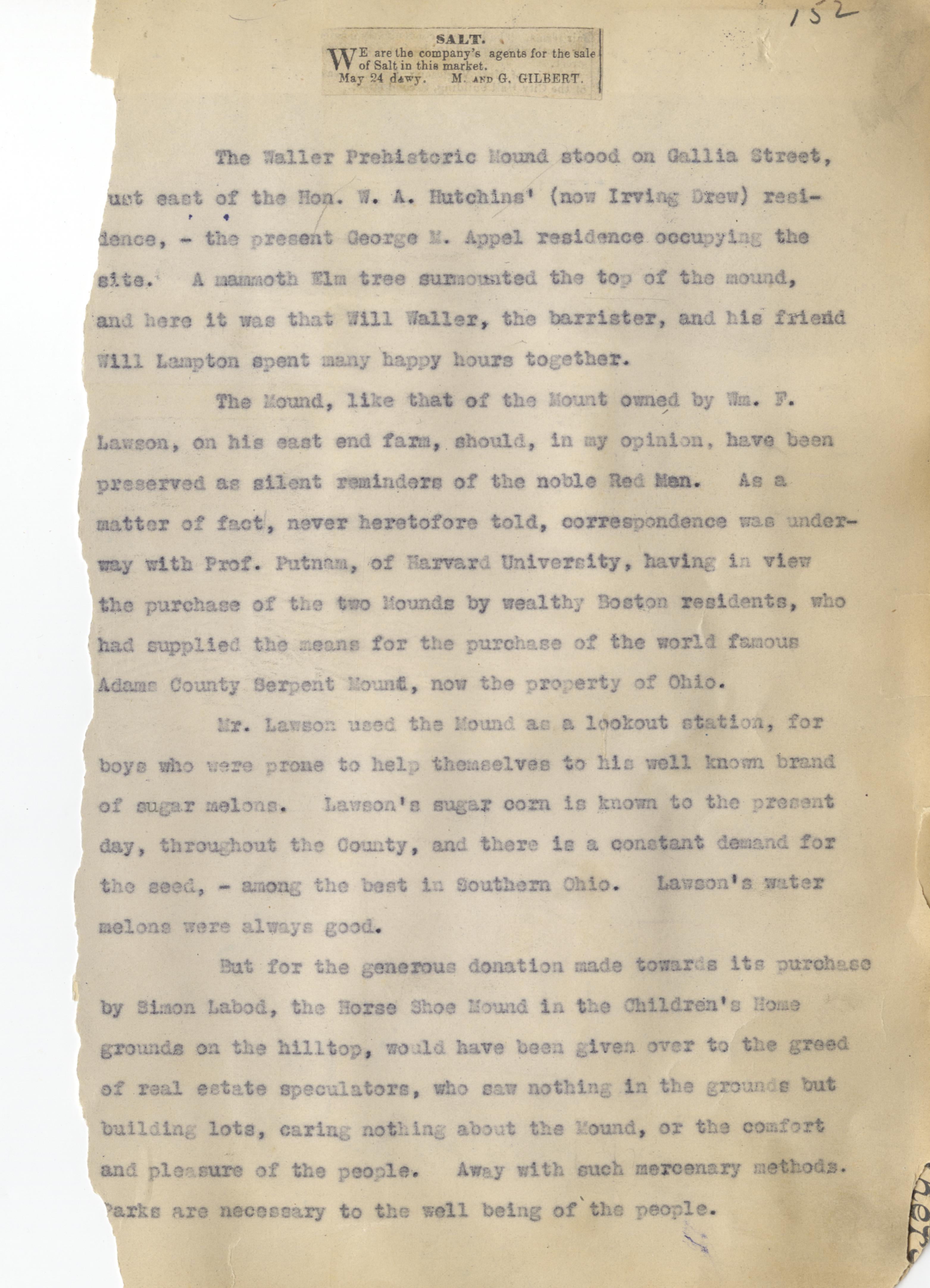 - Photo image of scanned scrapbook page. Pictured is a typed page giving details about the local indian mounds. Waller Historic Mound on Gallia Street; Honorable W. A. Hutchins; Irving Drew; George M. Appel; Will Waller; Will Lampton; William F. Lawson's mound; Professor Putnam of Harvard University; Adams County's Serpent Mound; Lawson's sugar corn; Lawson's watermelons; Simon Labold; Horse Shoe Mound in the Children's Home