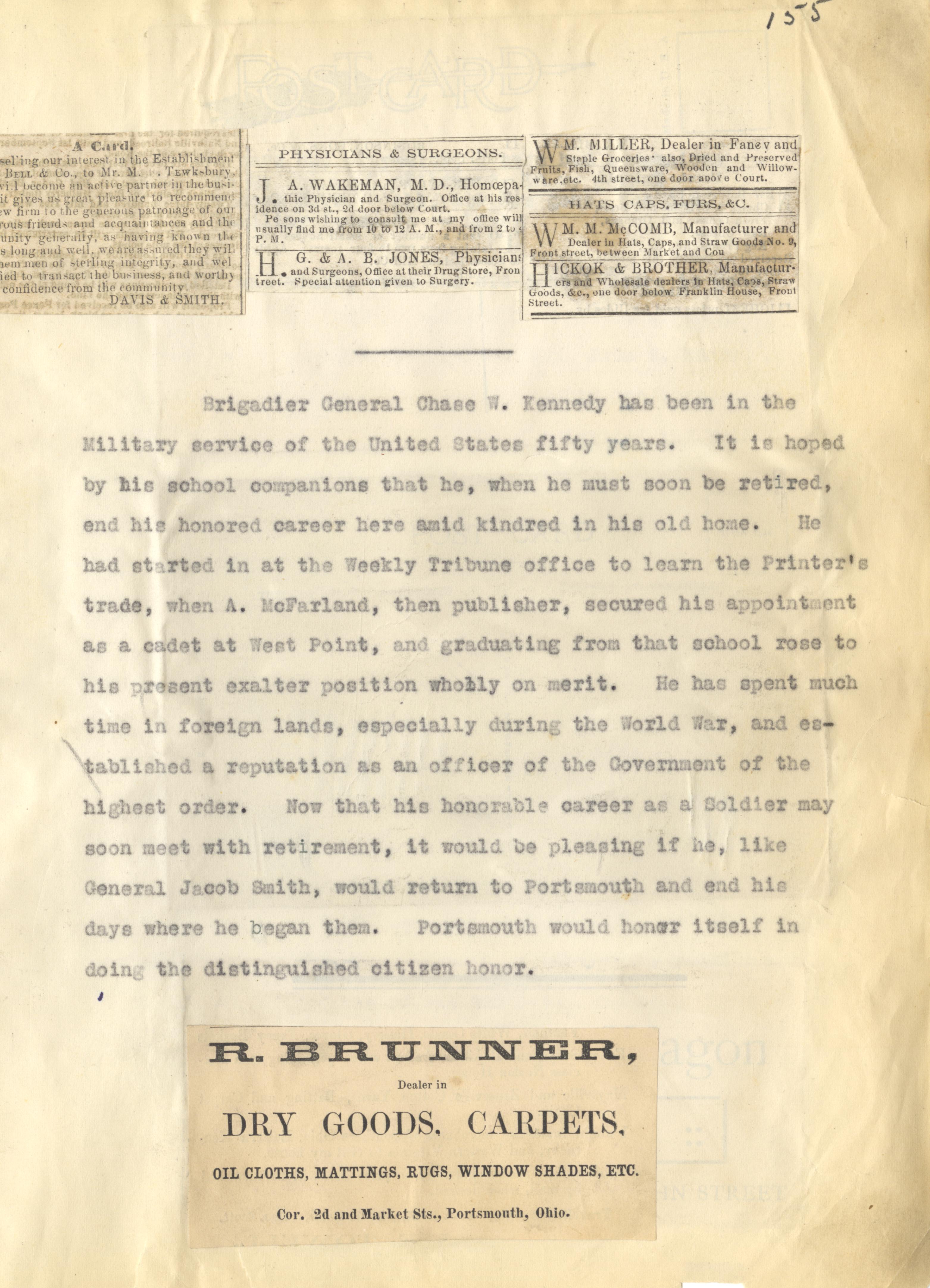 - Photo image of scanned scrapbook page 155. Pictured is a typed page with information about Brigadier General Chase W. Kennedy. Weekly Tribune; Printer's trade; A. McFarland; World War.