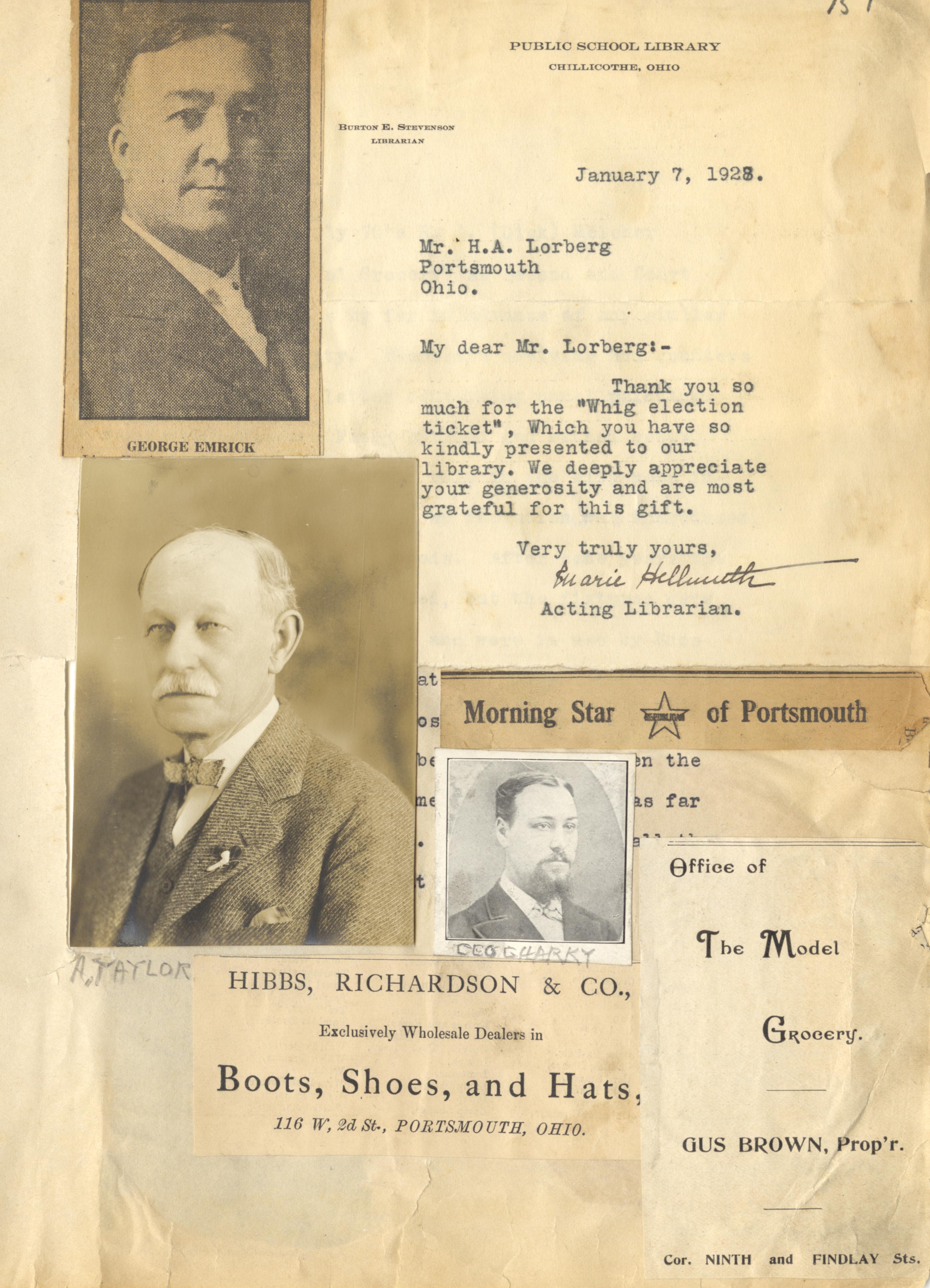 Henry A. Lorberg , “George Emrick; A. Taylor; George Gharky; Letter to H. A. Lorberg; Ad for Hibbs, Richardson & Co. and the office of the Model Grocery,” Scioto County Public Library Local History Digital Collection, accessed December 5, 2025, https://www.sciotolibrary.org/history/items/show/21400.