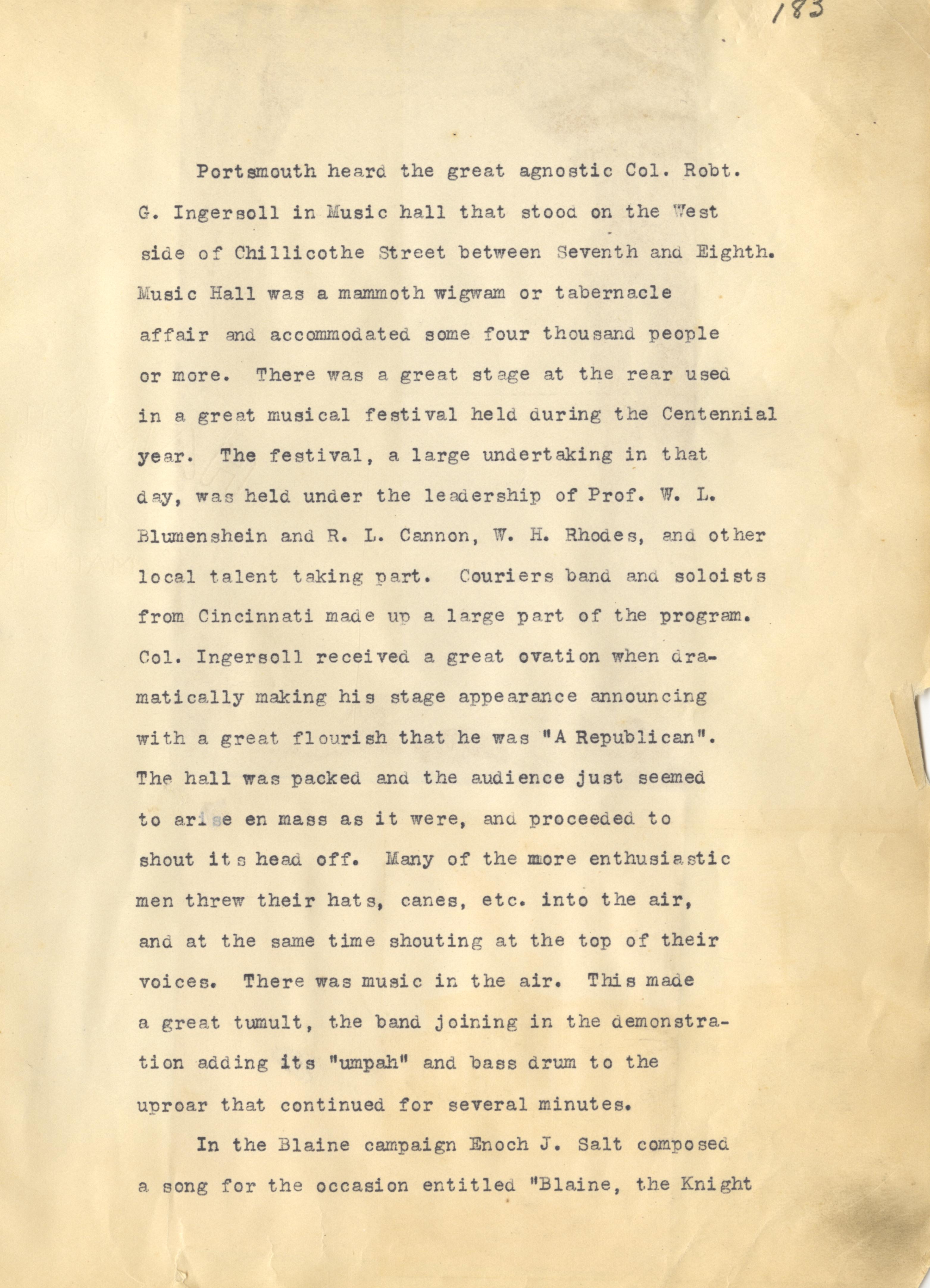- Photo image of scanned scrapbook page 183. Pictured is a typed page with details about musical events and festivals that happened in Portsmouth. Colonel Robert G. Ingersoll; Music Hall; musical festivals during the Centennial Year Celebration; Professor W. L. Blumenshein; R. L. Cannon; W. H. Rhodes; Blaine; Blaine Campaign; Enoch J. Salt