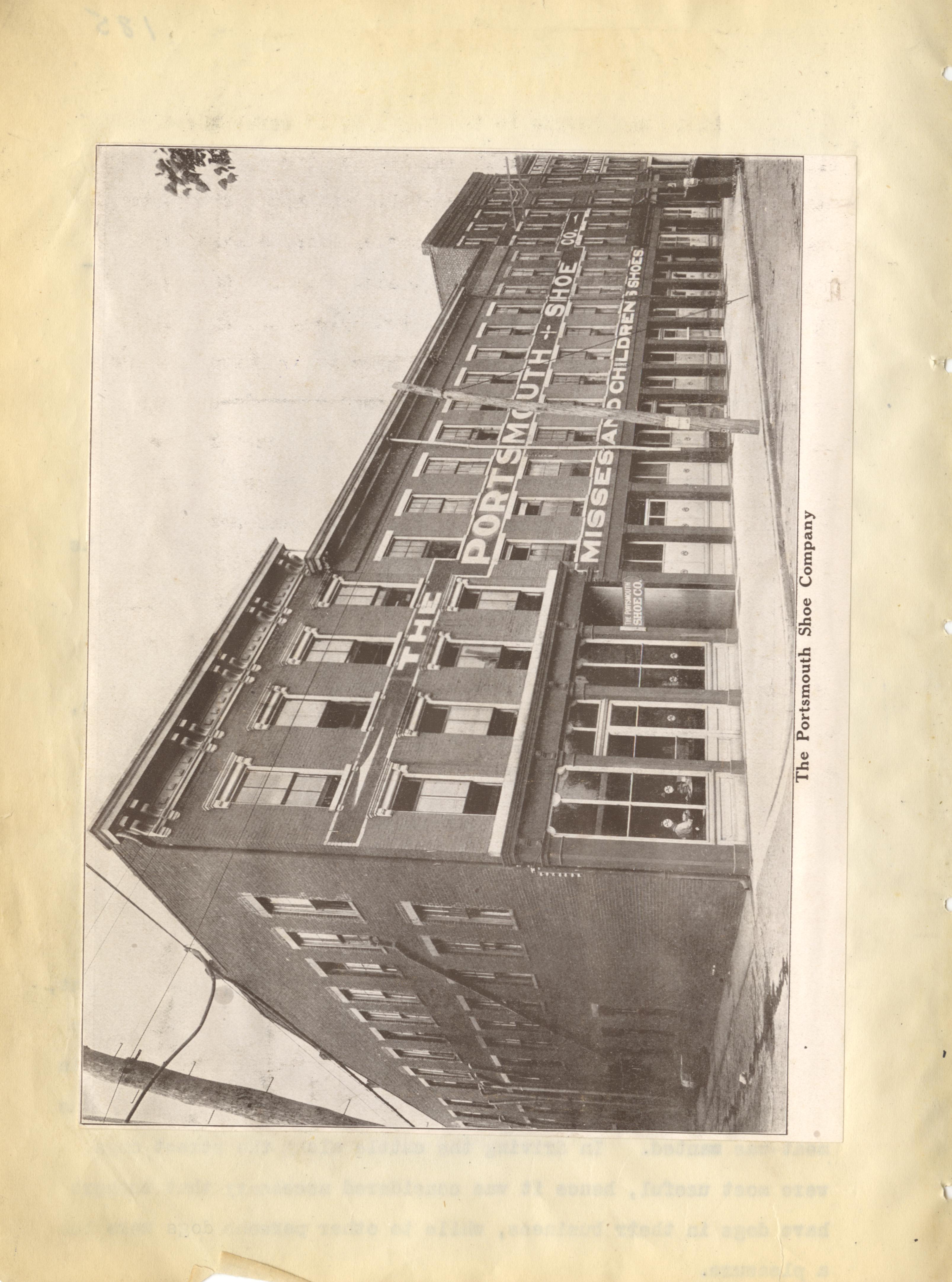 - Photo image of scanned scrapbook page. Black and white picture of the Portsmouth Shoe Company, located at 127 West Front Street. Cut from Pictorial Portsmouth.